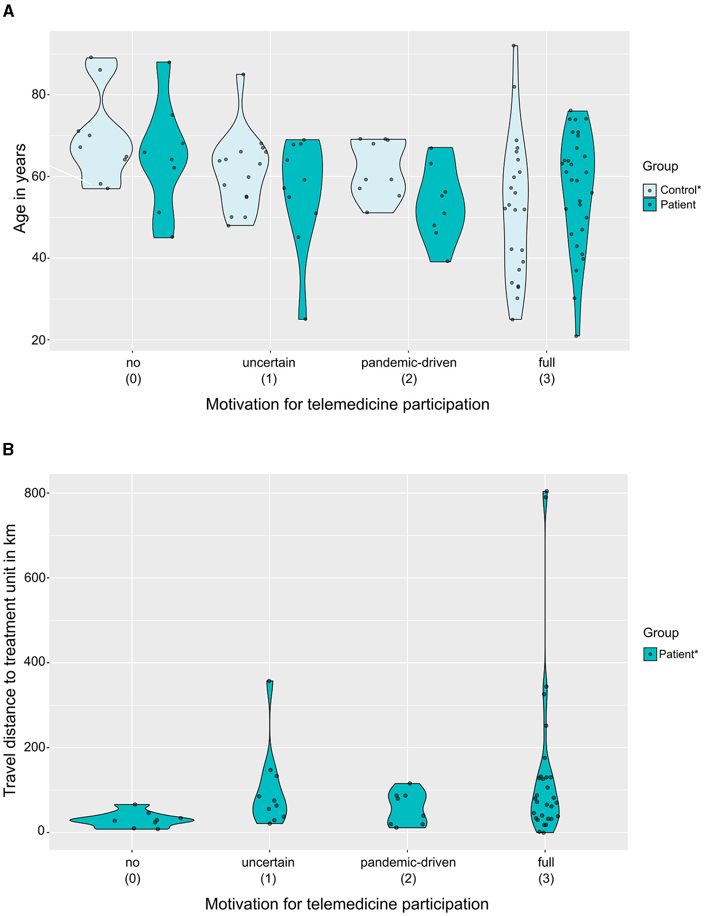 To explore and visualise the distributions of age and travel distance (from home to the specialised treatment unit) across motivational levels, violin plots with added scattered dots were created using the “gglot2” library (Wickham, 2016) and the {geom_sina} function of the “ggforce” library in R (Pedersen, 2022).