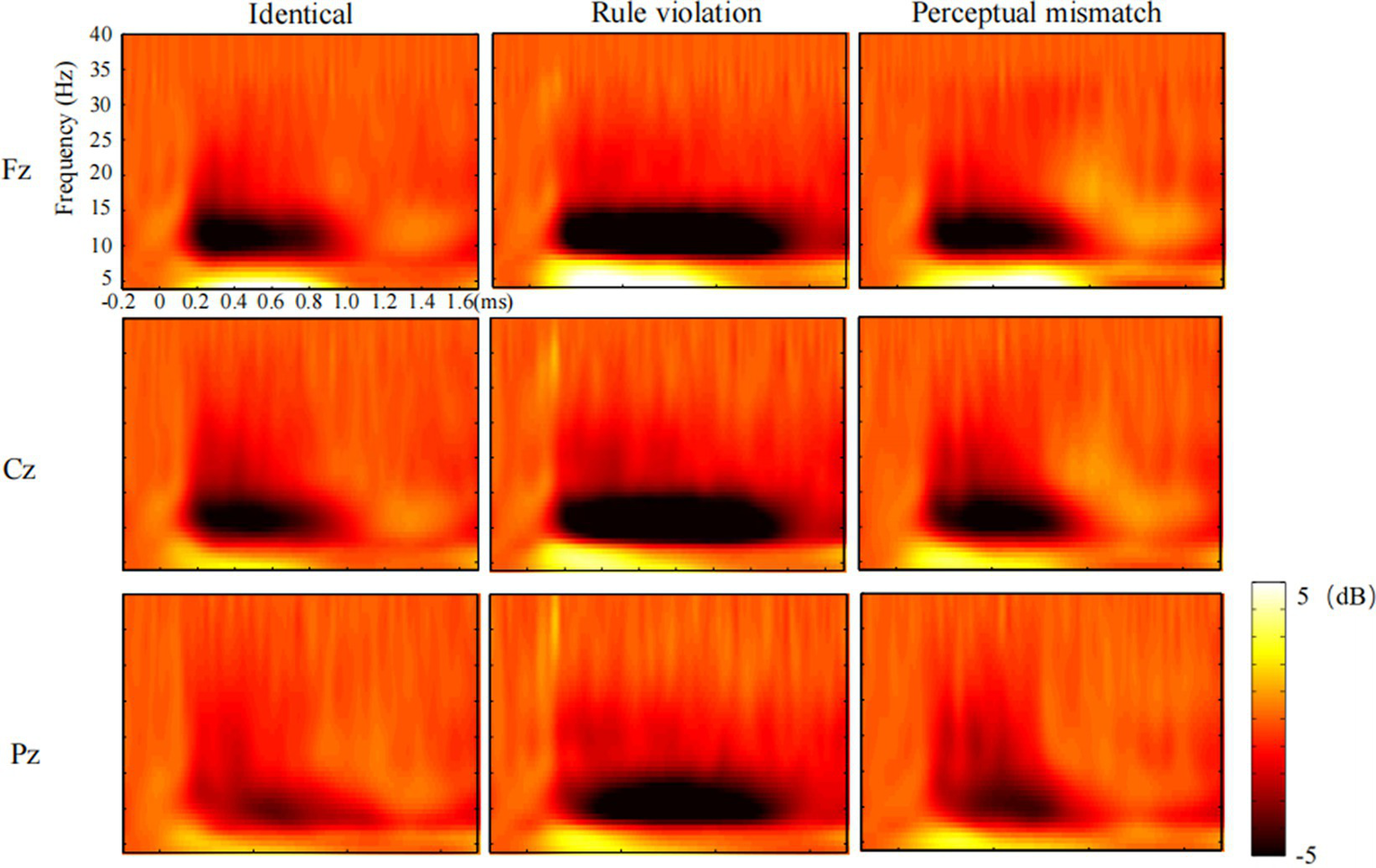 Based on visual inspection, theta band (4-8 Hz) oscillations were observed across all electrodes approximately 0-1000 ms after the presentation of the third number in all three conditions. Alpha band (8-13 Hz) oscillations emerged around 0-1000 ms after the third number presentation in the identity and perceptual mismatch conditions, and within 0-1400 ms in the rule violation condition. Following Xiao et al. (2018), a total of nine electrodes were selected, encompassing the frontal (F3, FZ, F4), central (C3, CZ, C4), and parietal (P3, PZ, P4) regions. A two-factor repeated-mearsures ANOVA (9 Electrode sites × 3 conditons) was conducted to elucidate variations among these three conditions during two distinct time windows: 0-1000 ms and 1,000-1400 ms. The p-values were corrected using the Greenhouse–Geisser method, and the post hoc tests were corrected using the Bonferroni method.