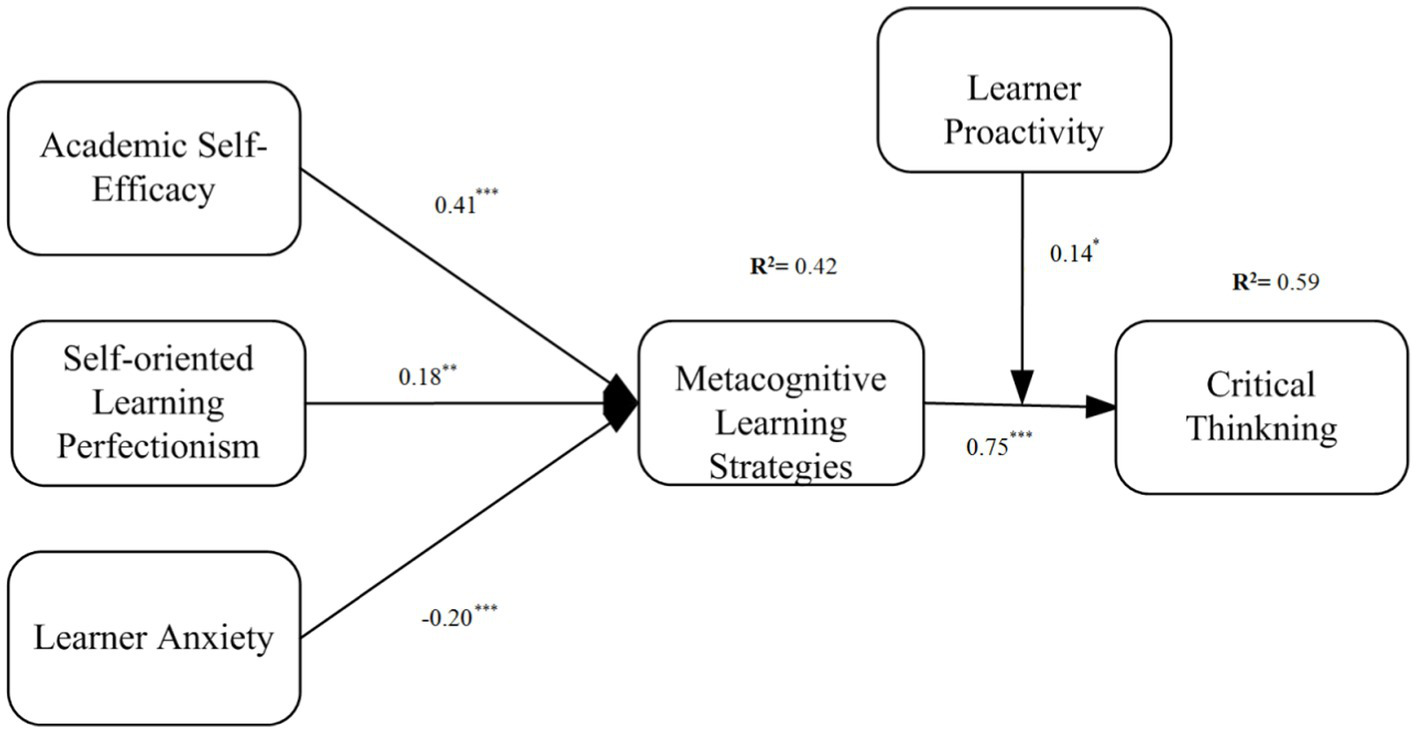 The goal of critical thinking for students is to help them learn how to think critically and systematically so they can solve problems and make informed decisions. It aids students in developing their capacity for independent thought, allowing them to generate their own conclusions and base those decisions on facts and evidence. Therefore, one of the key goals of this study was to explore the factors affecting critical thinking of English as foreign language (EFL) learners. This article used social cognitive theory (SCT) to investigate how personal and cognitive factors affect EFL learners’ critical thinking. Data from 305 Chinese EFL learners were collected online, and structural equation modeling (SEM) was used to evaluate the data. The results showed that metacognitive learning strategies (MLS) were positively related to critical thinking and that self-efficacy, self-oriented learning perfectionism, and learner anxiety were significantly related to MLS. Moreover, MLS mediated the link between self-efficacy, self-oriented learning perfectionism, learner anxiety, and critical thinking. The findings further indicated that learner proactivity moderated the association between MLS and critical thinking. By applying social cognitive theory to examine the variables influencing EFL learners’ critical thinking, this study adds uniqueness. It does this by emphasizing the moderating influence of learner proactivity and the mediating function of metacognitive learning strategies. The findings of the research have significant ramifications for educators since they emphasize how vital it is to support metacognitive strategies for learning in order to improve EFL learners’ critical thinking abilities. Additionally, to create an atmosphere that is favorable for the development of critical thinking skills in EFL education, policymakers should think about implementing support systems and interventions that focus on learner anxiety, learner proactivity, and self-efficacy.