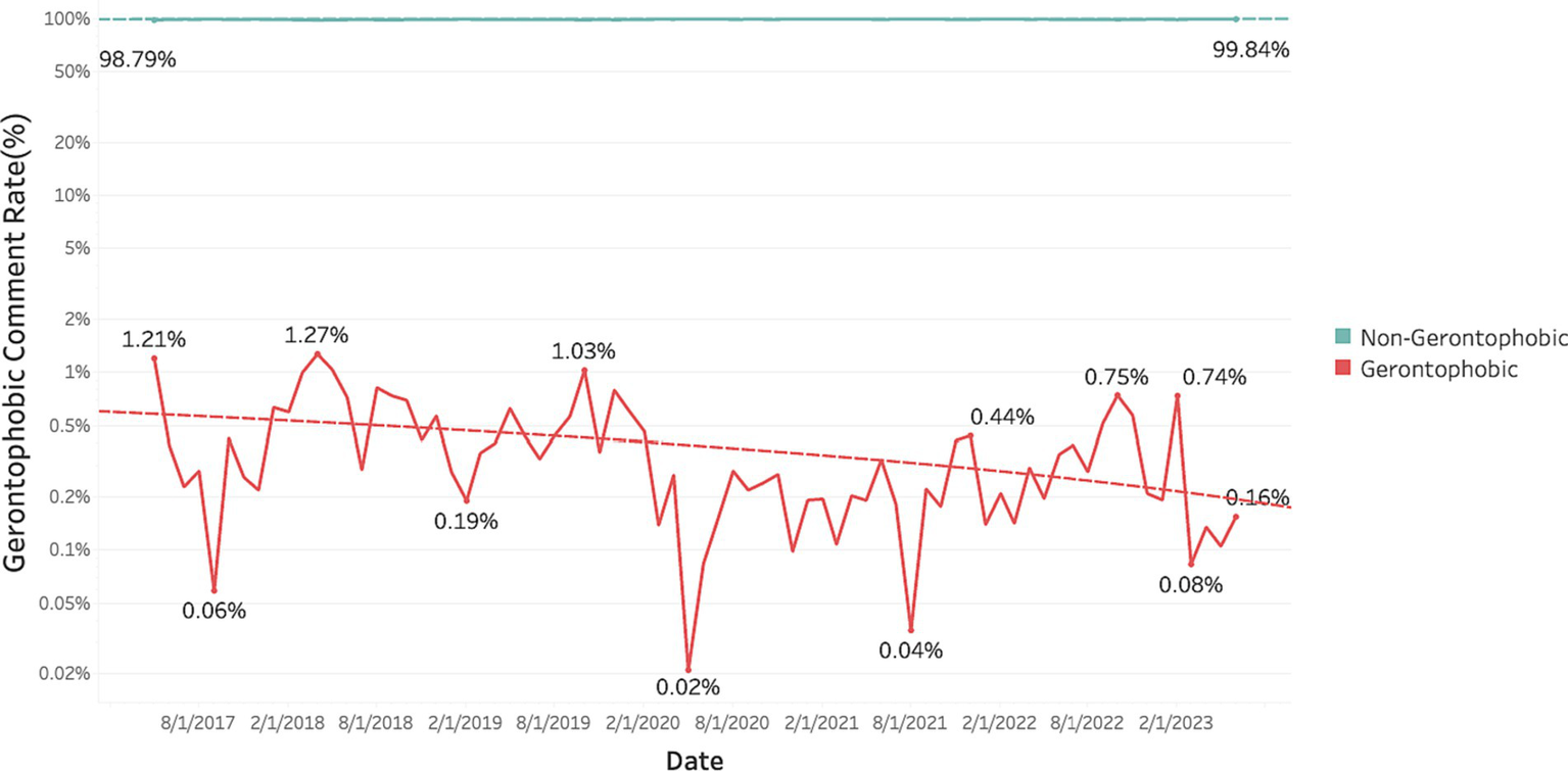 RQ1: How has the proportion of comments containing gerontophobic expressions changed over time in news discussions?