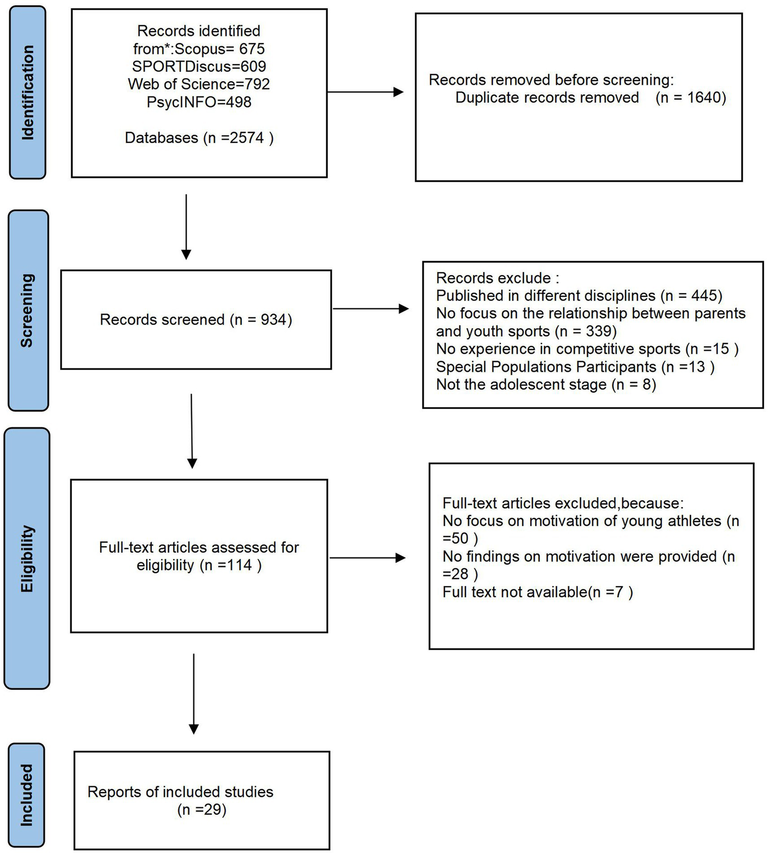 This study adheres to the guidelines of the Preferred Reporting Items for Systematic Reviews and Meta-Analyses (PRISMA) (Moher et al., 2015). The search process, as illustrated in Figure 1, involves a hierarchical assessment. Initially, the literature retrieved from the search was downloaded to Zotero for study selection based on titles and abstracts, after removing duplicates. Subsequently, the full texts of the remaining studies were retrieved and assessed for eligibility. If necessary, both abstracts and full texts were screened. Any discrepancies regarding the inclusion of specific studies were resolved through consensus meetings. In cases where consensus was not reached, a third researcher made the final decision on inclusion or exclusion. The first author conducted each search, and basic information (i.e., authors, publication year, and article title) of each retrieved article was recorded in a Microsoft Excel® spreadsheet to ensure comprehensive audit tracking. The initial search yielded 2,574 published papers, and after removing duplicates, 934 papers remained. A total of 445 papers were further excluded for being published in different disciplines. Another 339 papers were excluded for not focusing on the relationship between parents and youth sports. Thirty-six papers were excluded due to lack of competitive sports experience, participation of special population groups, and primary subjects not being adolescents. Of the remaining 114 papers, 85 were further excluded because they did not focus on the motivation of young athletes, did not provide results about motivation, or did not have the full text available. As a result, 29 papers were included in this systematic review.