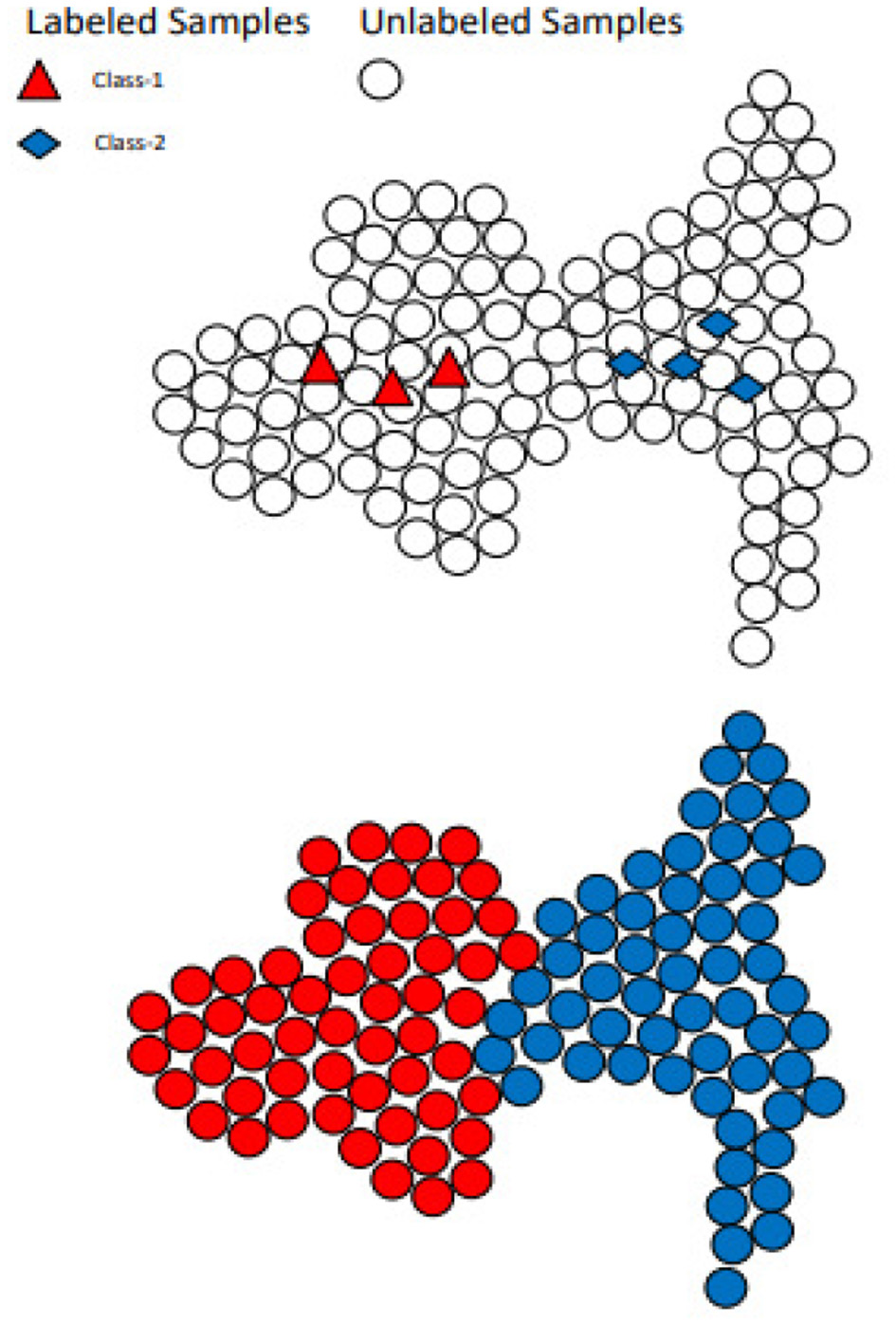 The algorithm was developed by Zhu and Ghahramani (2002). The mathematical formulation can be expressed as: Labeled data:
