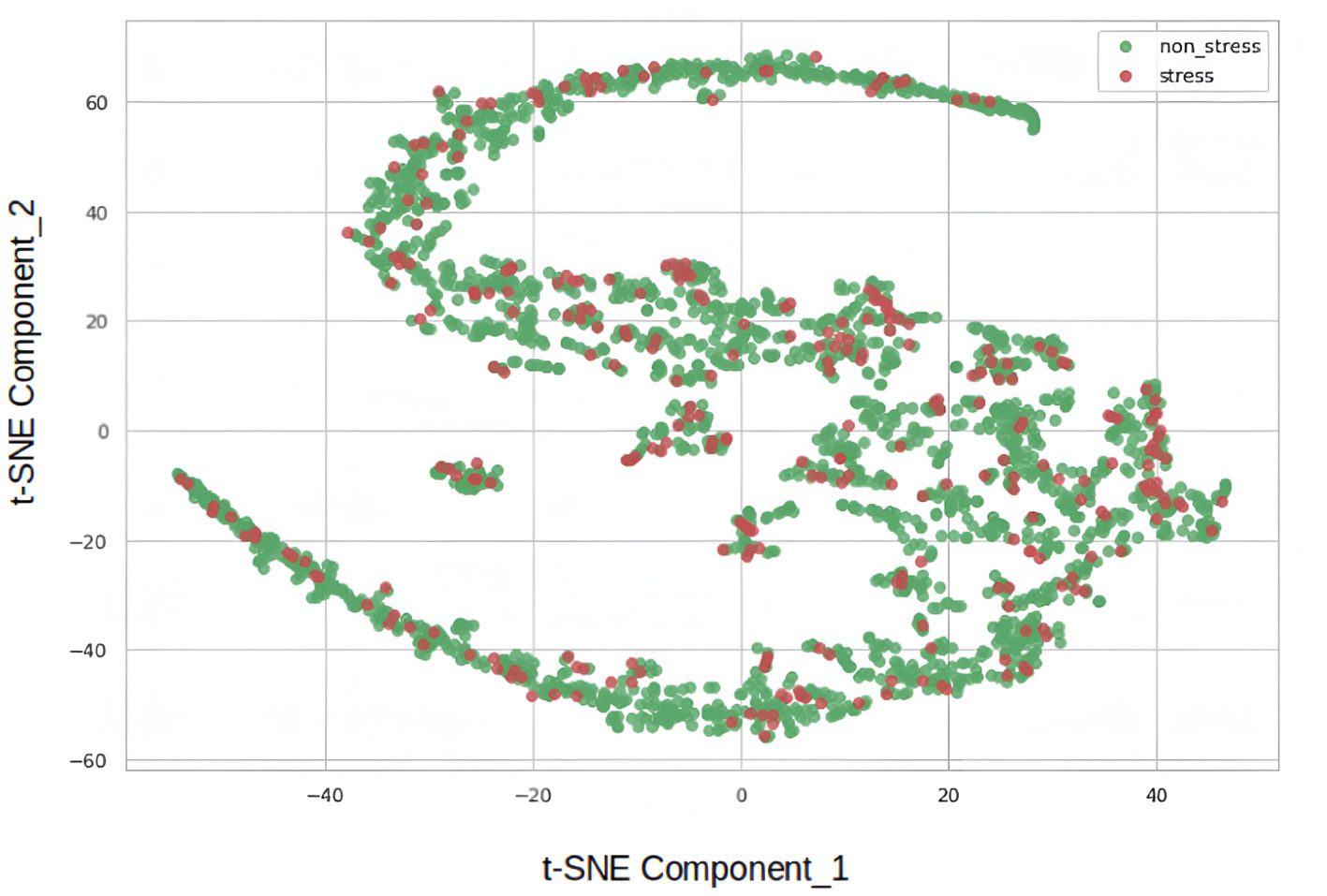Moreover, the underperformance of the simple autoencoder model prompted us to experiment with a deep autoencoder design. Prior to the hyper-parameter tuning stages, visualizing the data using the t-Distributed Stochastic Neighbor Embedding (t-SNE) nonlinear statistical method was deemed useful. The t-SNE algorithm, developed in 2008 (Van Der Maaten and Hinton, 2008), reduced the dimensions of the data, providing a two-component representation. Figure 3 depicts the result, where red dots represent the stress class, and green dots belong to the non-stress class. The close proximity of samples from both classes suggests that the dataset poses a significant challenge for simple models.