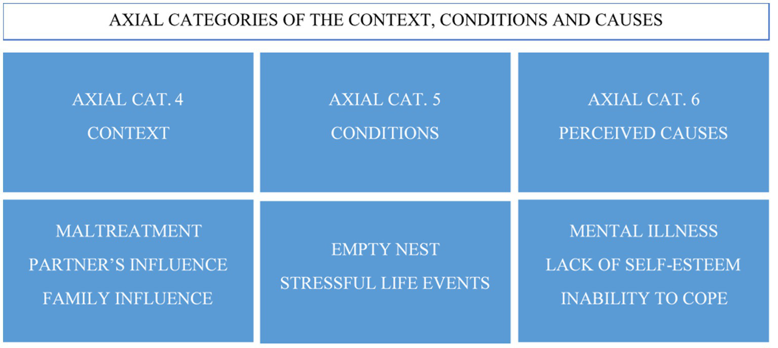 Axial categories of the context, conditions, and causes of the phenomenon.