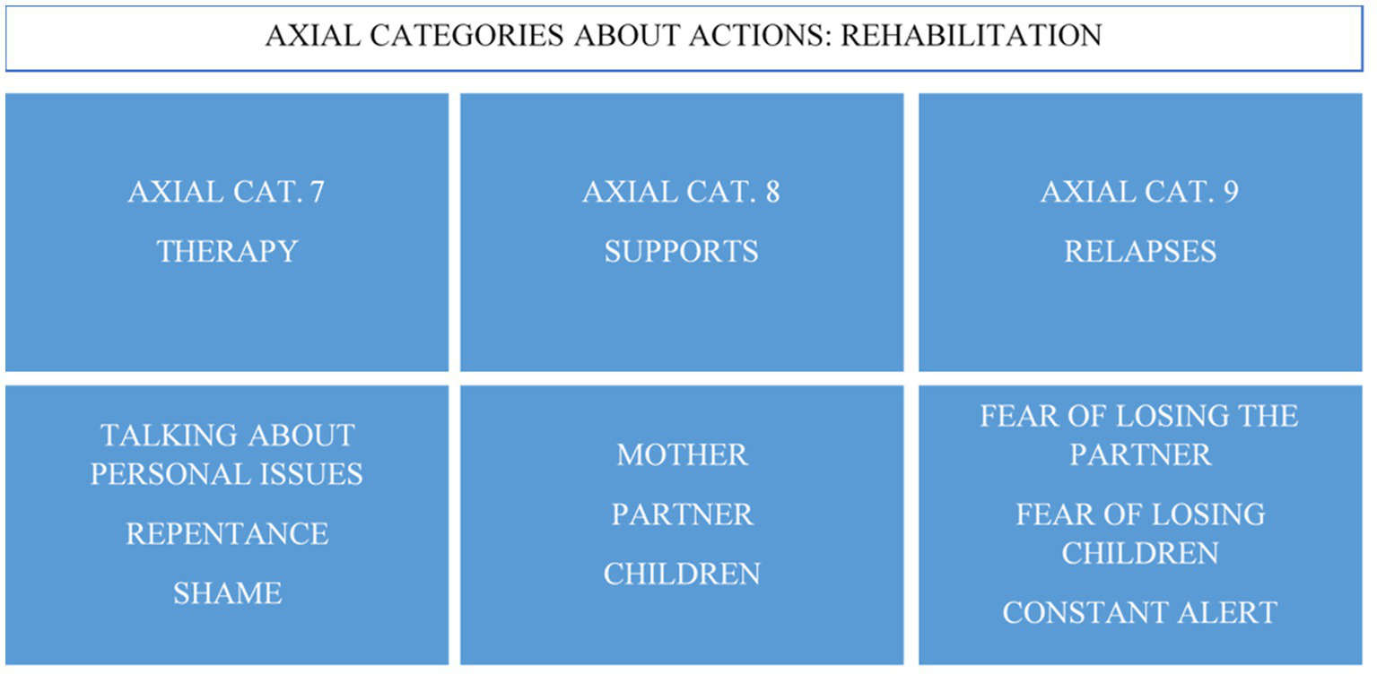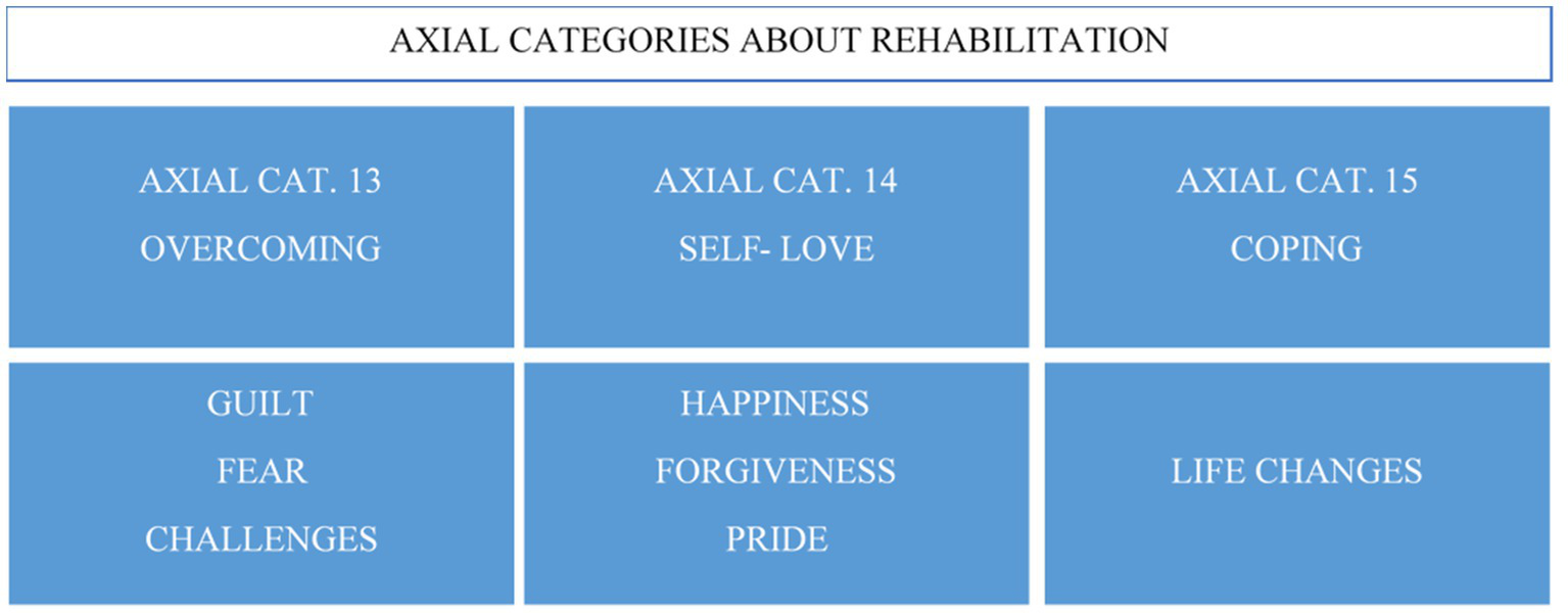Regarding the research participants’ actions related to the gambling disorder, the analysis of results showed three new axial categories, forming the axis-category called rehabilitation (Figure 3). The therapy was considered a time where they can talk about personal things, a meeting space, and an opportunity for emotional venting. In therapy, these women could express their feelings of regret and shame, especially in the initial phases of treatment. As a result, they discovered that everything they had experienced is recognized as a disease, and this recognition helped them deal with the stigma of vice surrounding this disorder.