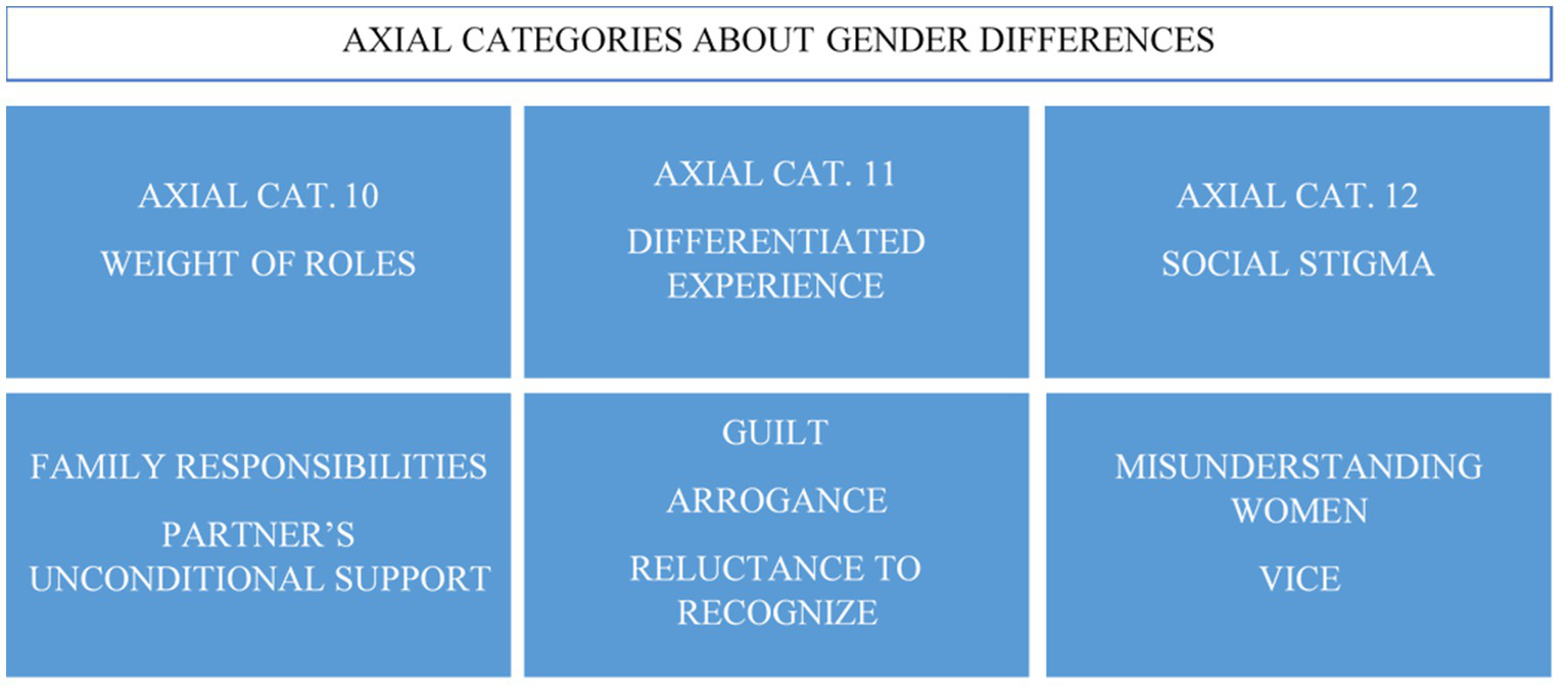 Rehabilitation may be where differences between women and men with gambling disorder are most noticeable. Co-participation in mixed therapies of both women and men made the participants directly witness the differences between the sexes. Once these axial categories were detected, work was carried out on the other axial categories, leading to the verification of the differences specified in three axial categories: the weight of gender roles, differentiated experience, and the social stigma associated with women (Figure 4).