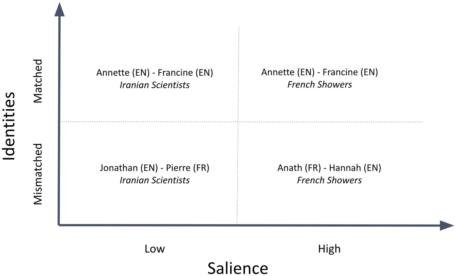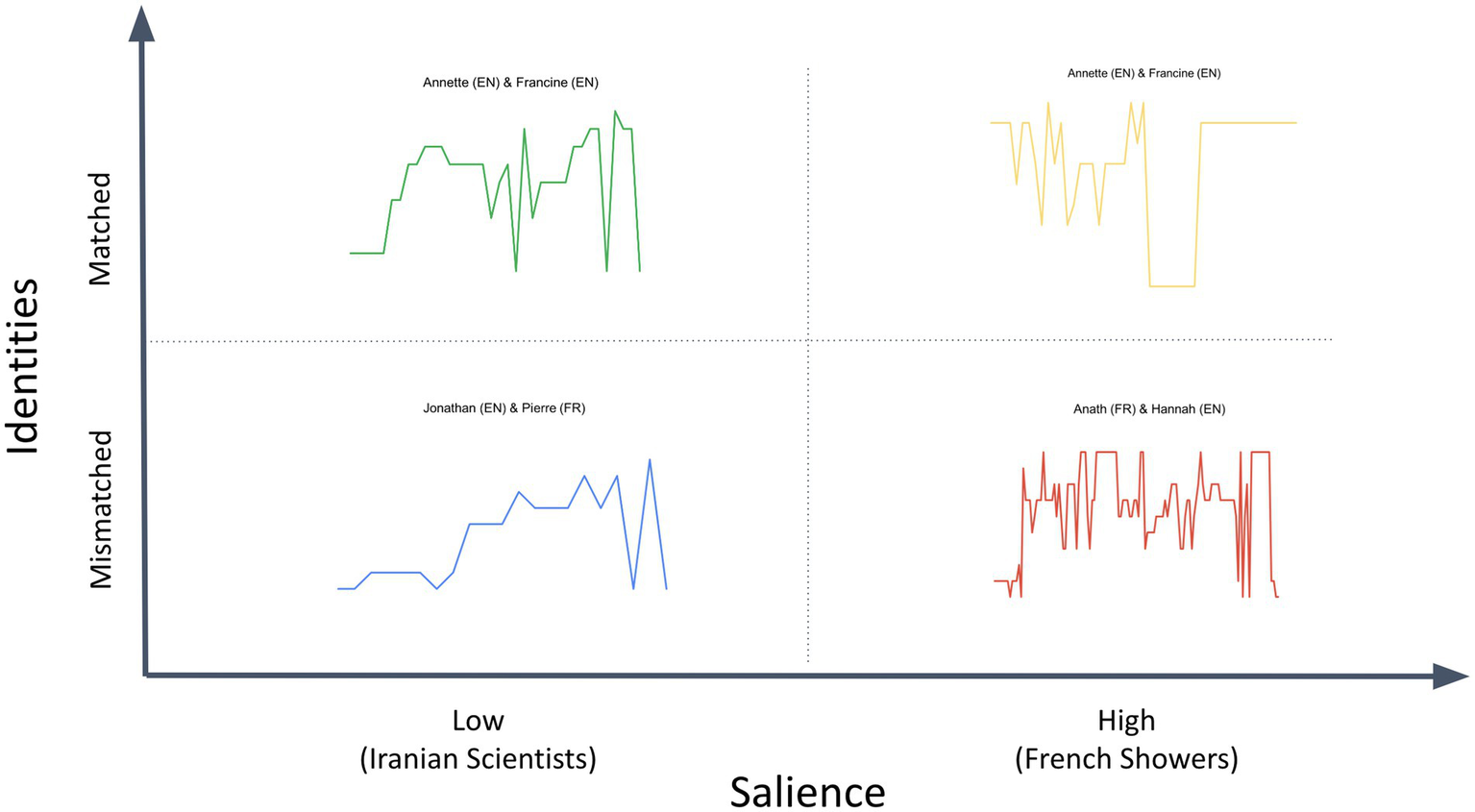 To investigate the effects of participants’ cultural identities on their joint fact-checking deliberations, we used a classic 2 × 2 design to compare the deliberations of participant pairs that were matched for cultural identity (e.g., English-English) with pairs that were mismatched (e.g., English-French); and deliberations in which Tweet content that was of high identity-salience to the participants (e.g., an English-French pair fact-checking a Tweet about how often French people shower) with those in which Tweet content was of low identity-salience (e.g., an English-French pair fact-checking a Tweet about the percentage of science and engineering graduates in Iran that are women.)