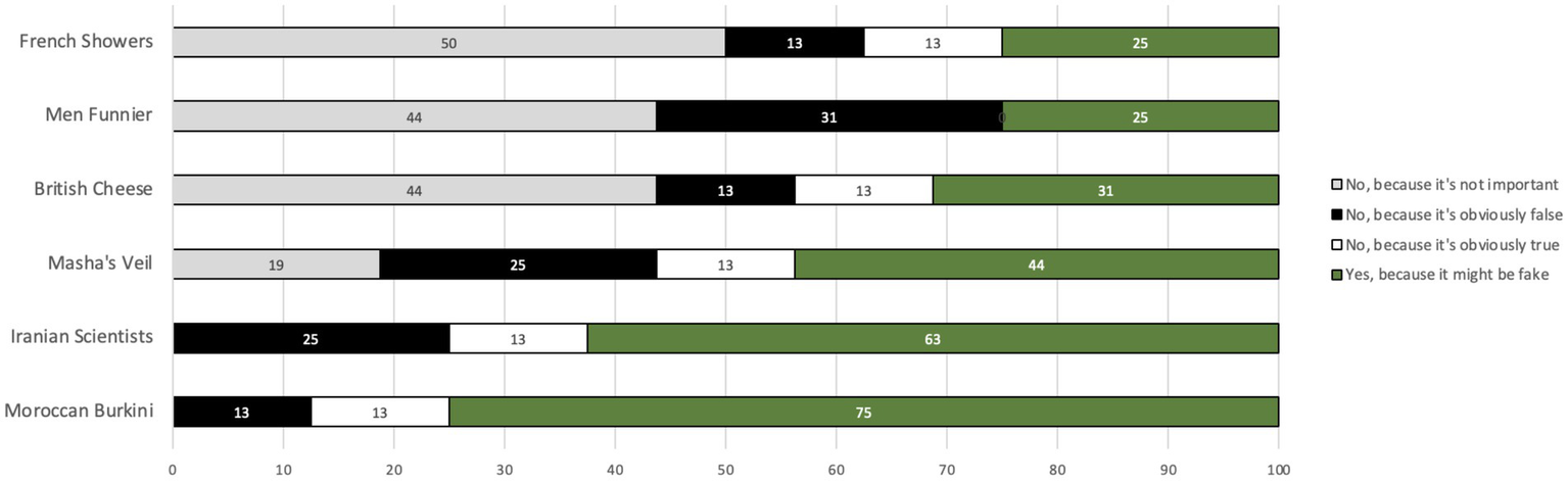 However, as can be seen in Figure 4, some of the tweets were considered more suspect than others. In particular, a majority of participants reported that they’d check the tweets reporting that most science and engineering graduates in Iran are women, and that burkinis are banned in Morocco, because they suspected these might be fake. In contrast, the tweets claiming that only 43% of French people shower daily, that Britain produces more varieties of cheese than France, and that men are funnier than women, were considered by around half of the participants (50, 44, and 44%, respectively) to be insufficiently important to merit fact-checking. Especially interesting is the finding that only a small minority of participants said the reason they wouldn't check a given tweet was because it was obviously true (10%) or because it was obviously false (20%). In summary, it appears that the decision about whether or not to fact-check a given tweet hangs firstly on whether the reader considers the claim worthy of investigation and secondly on the extent to which the tweet seems true or false.