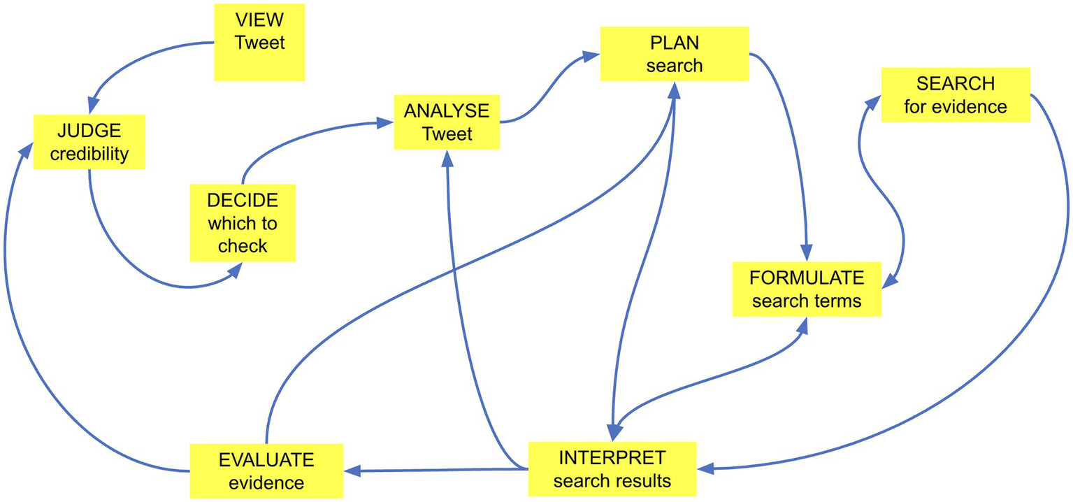 Our first finding was that, in contrast to Metzger’s (2007) linear theoretical model of credibility assessment of online information (see especially Figure 1 in Metzger, 2007, p. 2088), participants did not, in general, reach a judgment about the credibility of what they had read online after reviewing evidence. On the contrary, their review of evidence and deliberations on its quality and relevance was usually sandwiched between two or more credibility judgments. Typically, their joint deliberation began with an initial assessment of the Tweet’s credibility, to which they then referred when deciding whether or not to check it. This initial judgment was then updated iteratively over the course of the deliberation until a conclusion was reached.