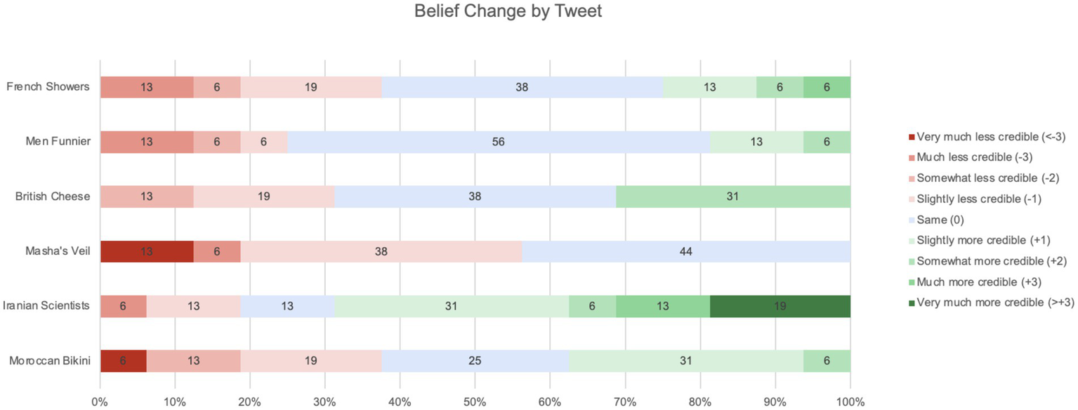 A short list of six (6) tweets was carefully chosen to be on the cusp of credibility (not too obviously true or false) and to relate in some way to the cultural identities of the participants. By cultural identities, we mean, following Tajfel (1974, p. 69):