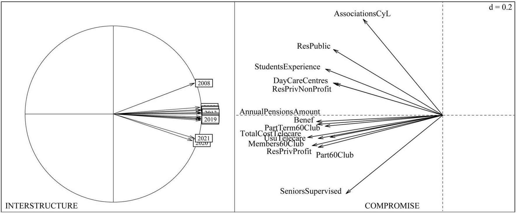 To analyze the common structure of social services for the elderly from 2007 to 2021, the STATIS method (Escoufier, 1973; Des Plantes, 1976) was applied. It is a suitable exploratory technique for three-way data analysis, in this case, information on social services for the elderly from 2007 to 2021 for the 9 provinces of the region studied. This method comprises three stages: the interstructure, the analysis of the compromise, and the intrastructure. For this paper, we will focus only on the first two.