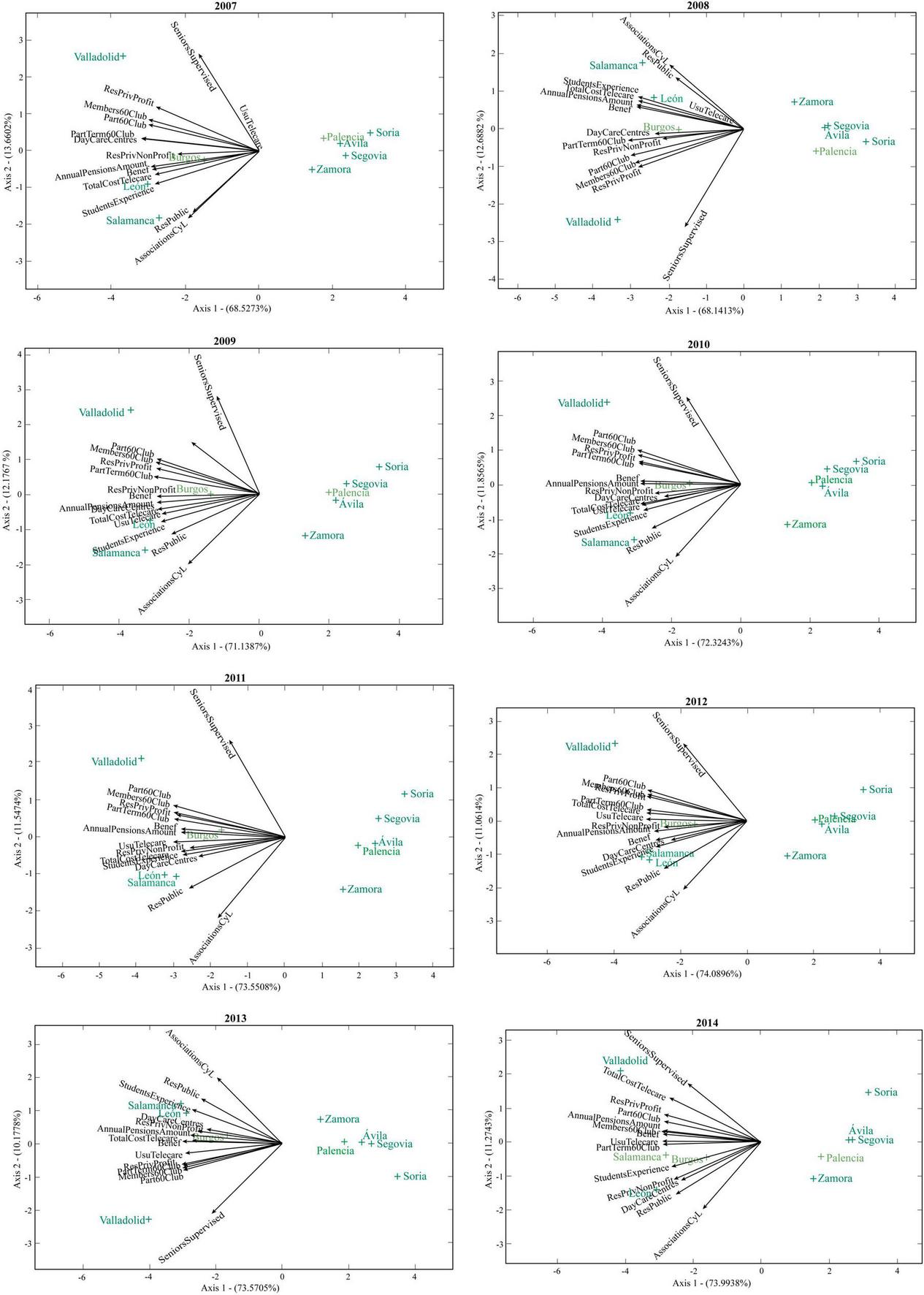 To study the relationships between social services for the elderly in the provinces of Castilla y León each year, an HJ-biplot analysis was applied (Galindo, 1986). Biplots (Gabriel, 1971) are statistical exploratory multidimensional techniques that represent the joint structure of the individuals (provinces) and variables (social services) of a multivariate data matrix X. We applied HJ-biplot because offers a representation in a low dimensional space of a matrix Xnxp. Let X = UDVt be the usual singular value decomposition (SVD) of X with U and V orthogonal matrices and D = diag(λ1,…,λp) containing the singular values. Let J and H be the matrices of the first two columns of UD and VD, respectively. This method allows, by the suitable selection of markers, ji = (ji,…,jn) for its rows and hj = (hj,…,hn) for its columns, to represent simultaneously in the same Euclidean space the rows and columns with the highest quality of representation. For its interpretation, we have to keep several guidelines going, so row markers (provinces) are represented as points and column markers (social services variables) as vectors. In this way, we can visualize a set of provinces with similar behaviors, interpreting the distance between points as similarity, so that provinces closer to other provinces present similar profiles. To describe the relationships between social services for the elderly, acute angles between vectors are associated with a high positive correlation. And, to classify the provinces in reference to social services, we can order the different province in relation to each variable with the orthogonal projections of the points (provinces) on the vectors (social services variables). Remember that the interpretation is subject to the quality of representation of the elements in the observed subspace.