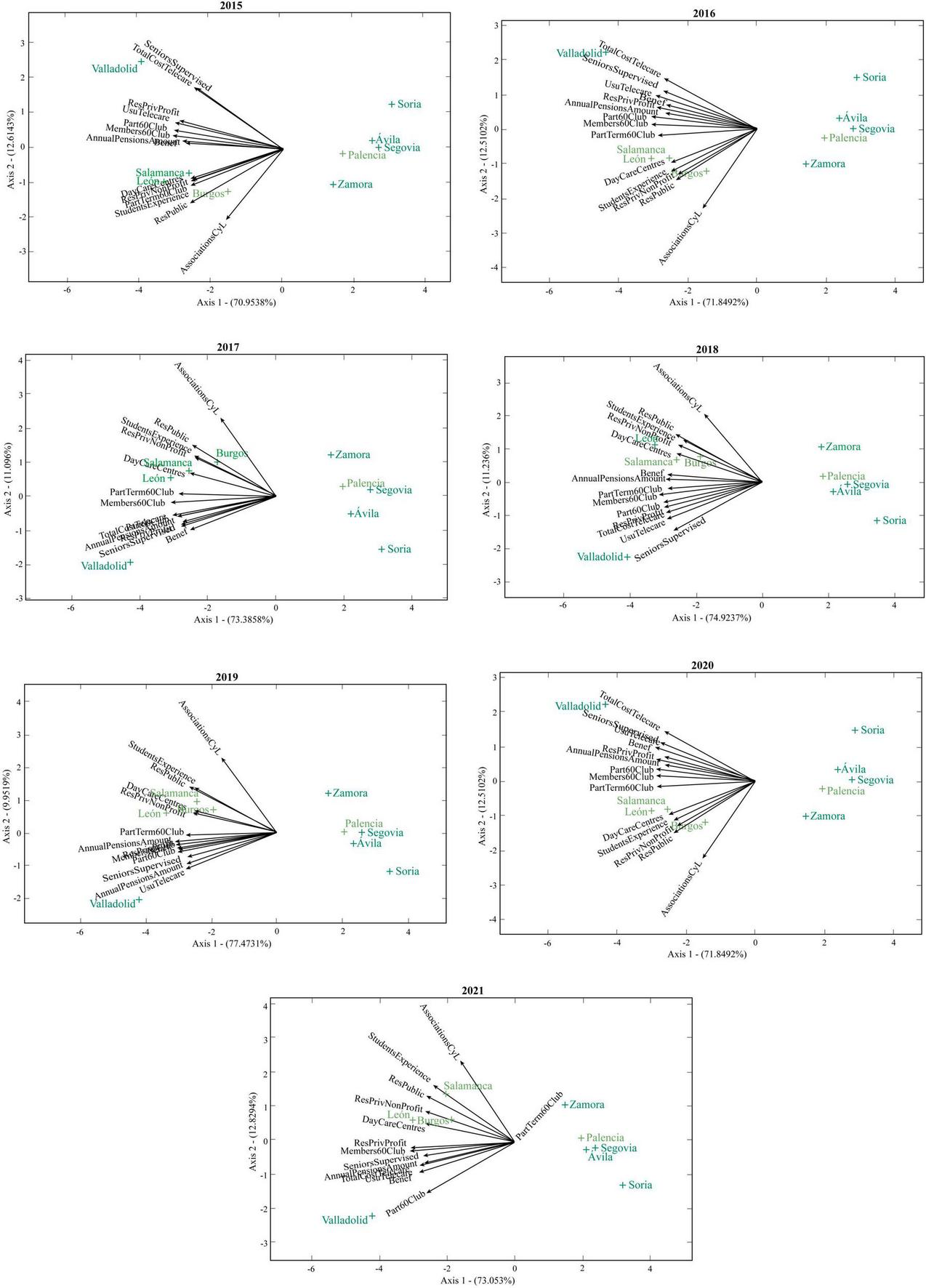 Official data from Junta de Castilla y León (Spain) on social services for the elderly in the 9 provinces of the autonomous community of Castilla y León from 2007 to 2021 were analysed using multivariate statistical techniques.