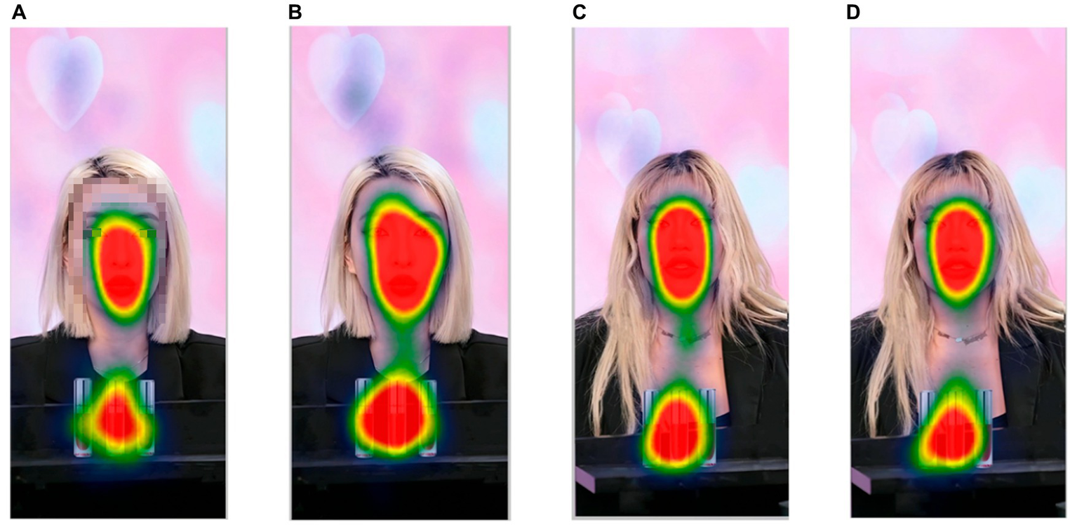 Eye-tracking technology, a non-invasive, simple and innovative cognitive neuroscience technique, is commonly used to explore consumers’ visual attention allocation and cognitive processes in response to a given stimulus (Just and Carpenter, 1980). Attention duration is one of the main measures of eye-tracking, and the longer the duration of attention to a stimulus usually indicates that the stimulus is more attractive to the consumer (Ji et al., 2023). Studies have shown that there is a general association between individual attention and visual aesthetics (Mitrovic et al., 2020), and that highly attractive faces are more effective in attracting the attention of subjects compared to less attractive faces (Valuch et al., 2015). In addition, Visual attention is often a prerequisite for the subsequent process of guiding consumers to choose a product (Behe et al., 2015). There are clear correlations between gaze and choice, and many studies have confirmed that there is a relationship between gaze allocation and choice (Armel et al., 2008; Shevlin and Krajbich, 2021). In the field of e-commerce and consumer behavior, eye-tracking techniques have been widely used, and Wang et al. (2017) found that when smile intensity is low, Duchenne smiles attract subjects’ attention to the model’s face and product information more than non-Duchenne smiles, and lead to consumers’ stronger purchase intention. Fei et al. (2021) confirmed that highly attractive streamers can immediately attract more attention, which in turn leads to more favorable responses from consumers to the information conveyed by the streamer.