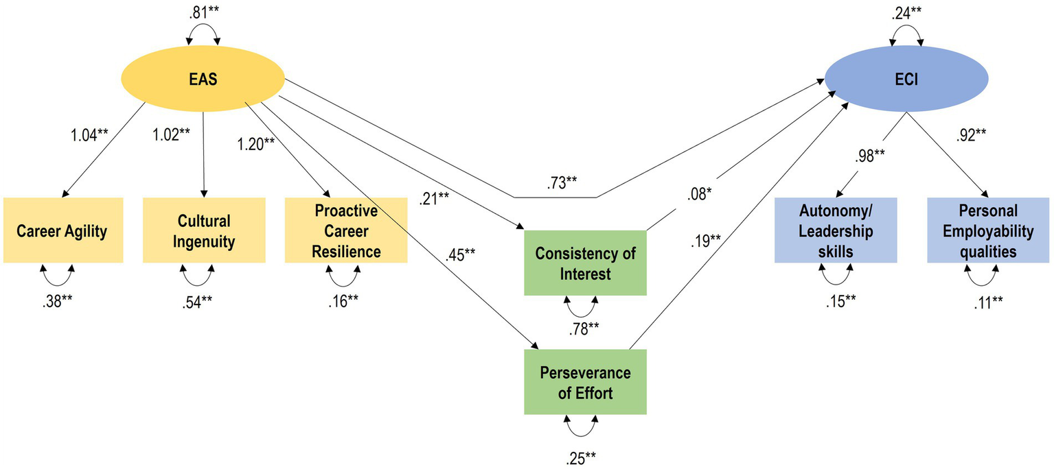 | Variables | Composite Reliability (CR) | Cronbach Alphas | Mean | Standard Deviation | Personal employability qualities | Autonomy/ leadership | Overall ECI | Career agility | Cultural ingenuity | Proactive career resilience | Overall EAS | Consistency of Interest | Perseverance of Effort | Overall SGS |