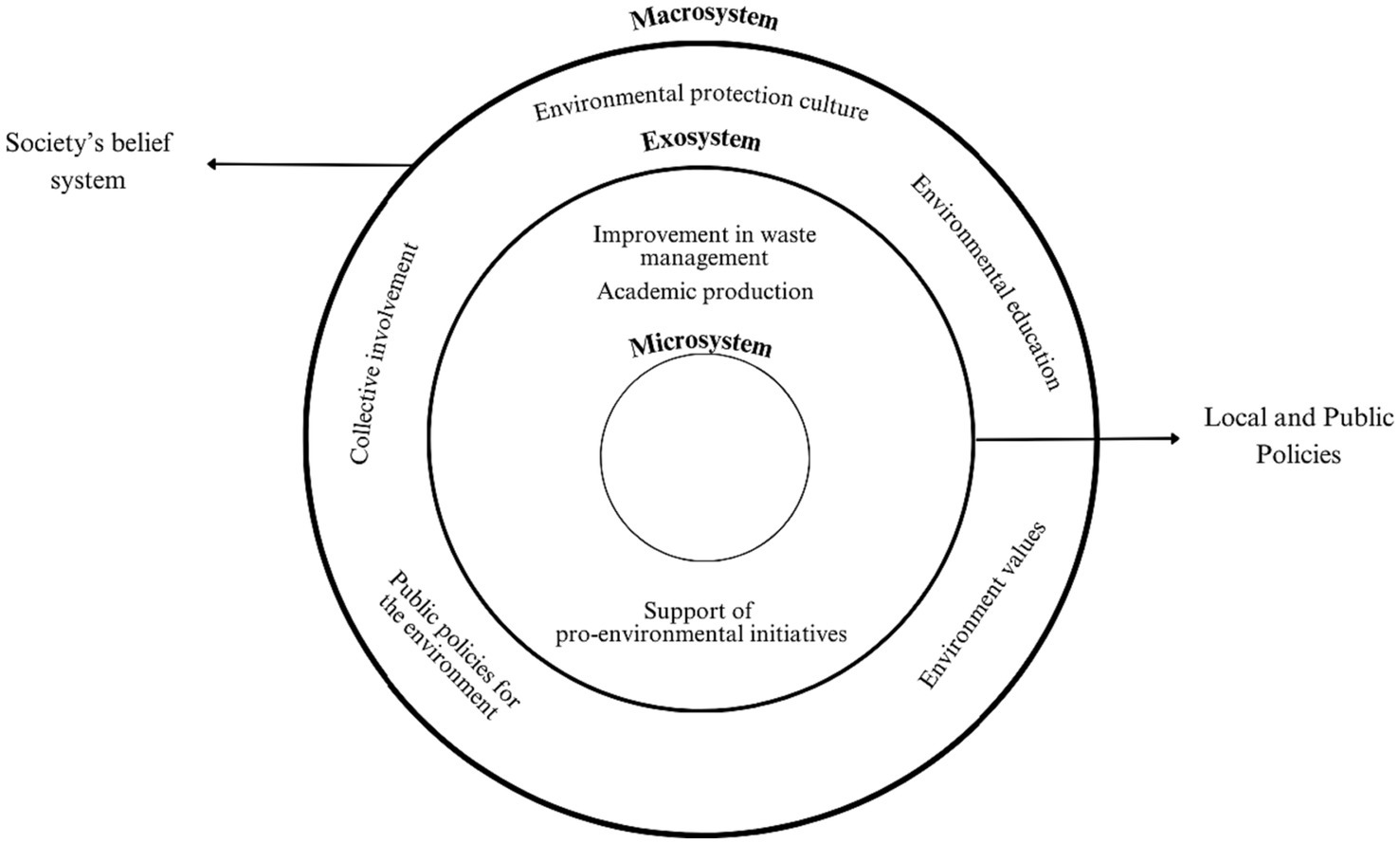 The fourth level refers to the society’s cultural proposal of prioritized values (Hoffman and Graham, 2015), such as pro-environmental values and environmental protection. These cultural or ideological elements are human-related and have influence on lower systems, hence, as a group, they form the macrosystem (Bronfenbrenner, 1979). Consequently, a society that promotes ecological attitudes and behaviors would build a citizenship culture that fosters environmental protection, expressed in the demand for environmental policies and the promotion of sustainable habits.