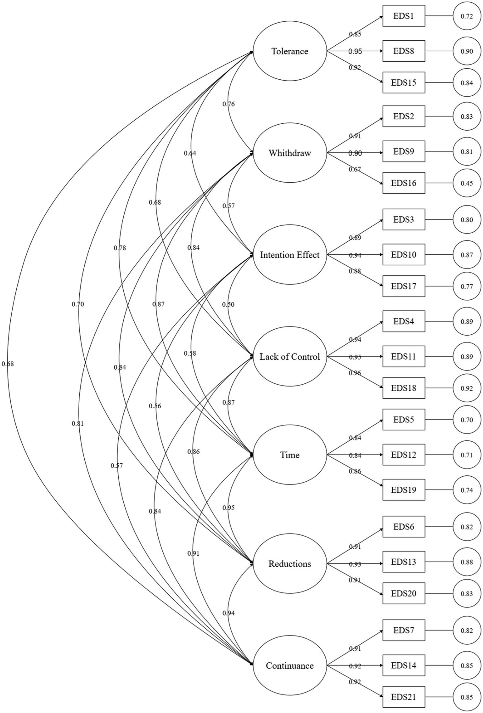 As shown in Tables 2, 3, descriptive statistics were calculated for each scale item and dimension score. The fact that the mean value of each item on the scale ranges from 1.80 to 3.19, the standard deviation ranges from 1.23 to 1.45, and the kurtosis and skewness of each item are between −2 and 2, demonstrates that EDS- R scores conform to a normal distribution (Potenza et al., 2013). McDonald’s ω was calculated for each dimension and the total scale. The McDonald’s ω for each dimension ranged from 0.87 to 0.97, and for the total scale was 0.973. According to the load factors of each item, CR and AVE of each dimension and the total scale were calculated. The CR of each dimension ranged from 0.87 to 0.96, while the AVE ranged from 0.69 to 0.90, with a total value of CR = 0.99 and AVE = 0.80., the greater the reliability of the scale. If the McDonald’s ω is below 0.7, it is considered insufficient for internal consistency and deemed unacceptable (Roco-Videla et al., 2023). In this study, the reliability is between 0.87 and 0.97, it is acceptable (Peters, 2014). CR > 0.7 and AVE > 0.5 are indicative of the scale’s high reliability (Fornell and Larcker, 1981), all scale dimensions and total scale indicators meet the standards. It can be concluded that all scale dimensions and the total scale are reliable.
