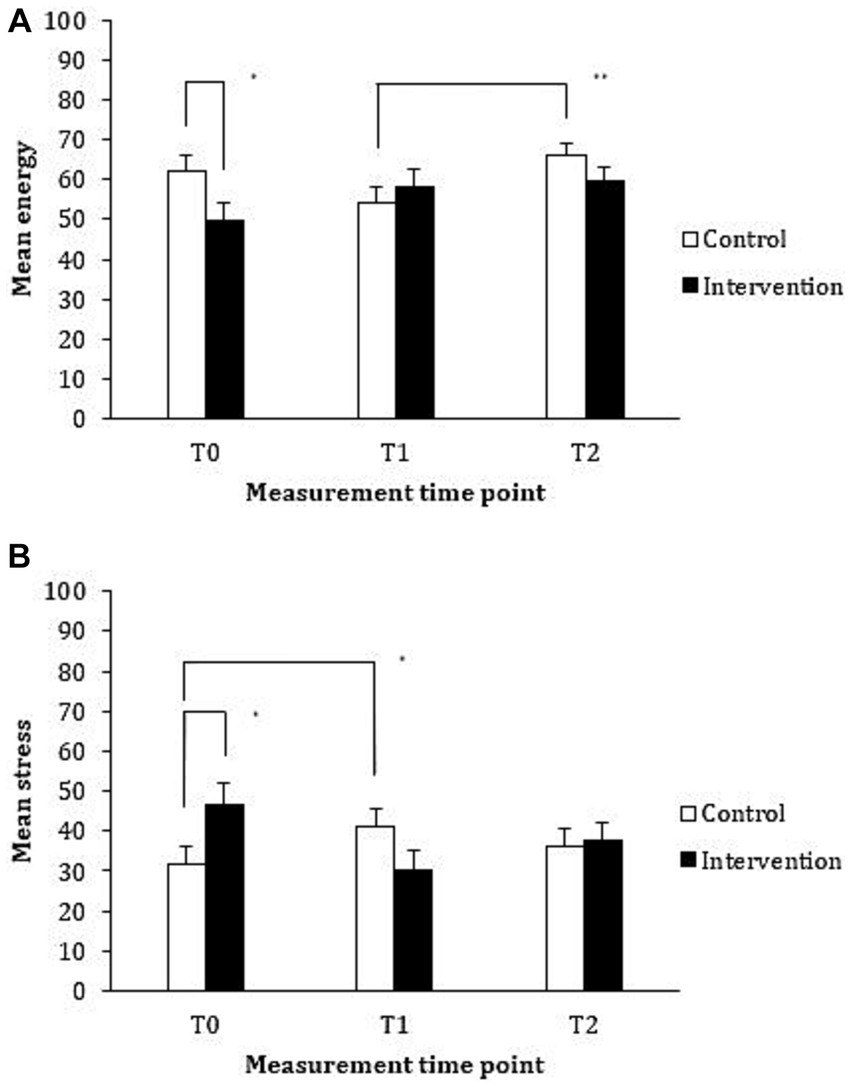 Hypothesis 2 (H2): The intervention will have a significant effect on our primary outcome measures of reported energy (H2a) and stress (H2b), resulting in a significant increase in reported energy and a significant decrease in reported stress for the intervention group (Time Point 0 to Time Point 1), and later for the control group (Time Point 1 to Time Point 2).