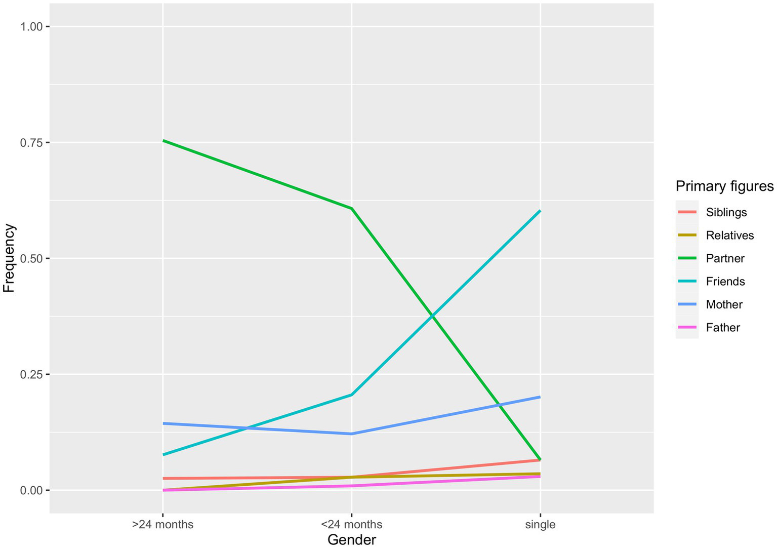 investigate the composition of attachment networks in the full sample of young adults. For this goal, we studied the reliance on each significant figure for each function, and overall attachment strength; additionally, we examined the presence of primary figures and full-blown attachments. In relation to this aim, we hypothesize that friends are crucial figures within the network, particularly for the safe haven function, while partners are expected to acquire greater relevance in the network (Hypothesis 1). We further hypothesize that these changes impact only partially on the relevance of mothers, with mothers still being central for the secure base function (Hypothesis 2);