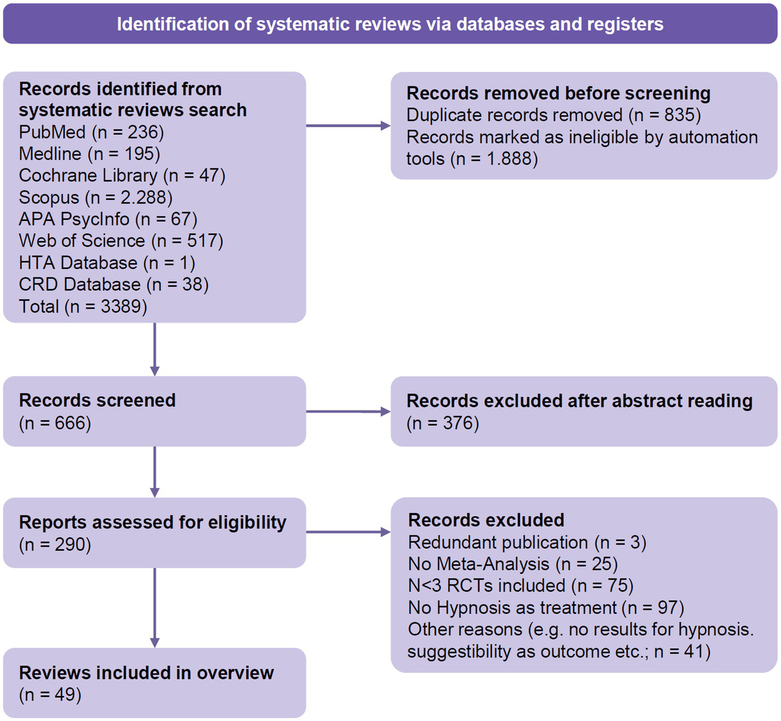 Our comprehensive search in various relevant data bases resulted in a total of 3,389 records. Of these, 2,723 duplicate and ineligible records were excluded. We screened 666 records, and after exclusion during abstract screening, 290 records remained and were screened for eligibility via full-text inspection. Of these, 241 reports were excluded due for reasons such as duplicate publication or failure to meet the inclusion criteria. Finally, 49 reviews were included in the present synthesis (Figure 1; Supplementary material 2). Studies that appeared to meet the inclusion criteria but were excluded during the selection process are presented in Supplementary material 3.