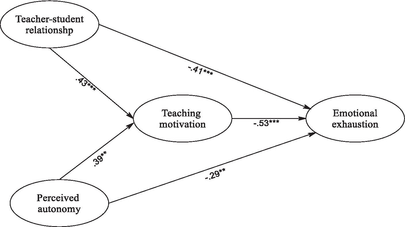 H3: Teaching motivation mediates the relationship between teacher–student relationship and teacher emotional exhaustion.