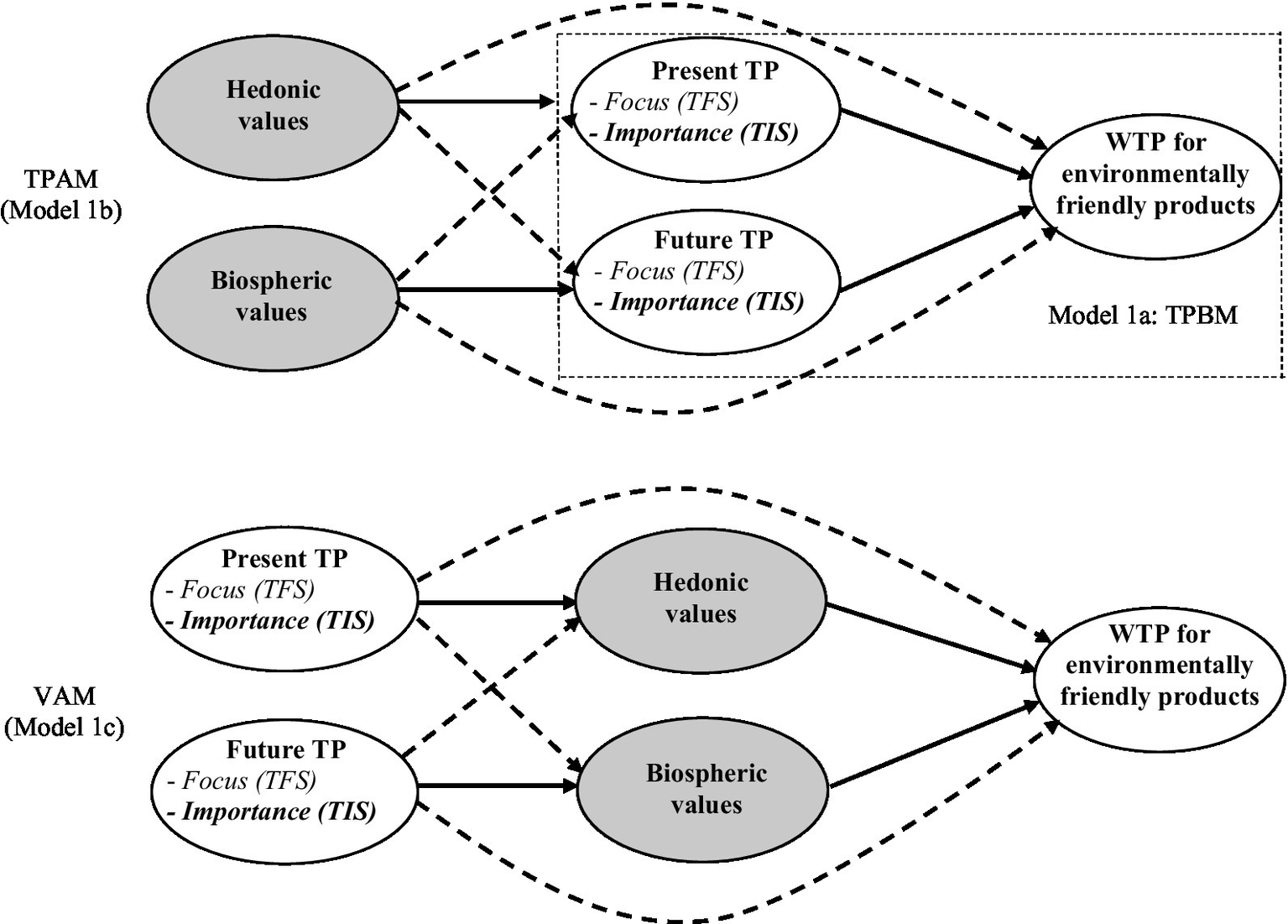 In summary, this study uses two different cognitive scales to assess future time perspectives: the Temporal Focus Scale (TFS: Shipp et al., 2009) and the new Time Importance Scale (TIS) that is based on the importance dimension of attitude strength theory (Howe and Krosnick, 2017). The Time Perspective Behavioral Model (TPBM) is shown as Model 1a in the rectangle in Figure 1. It only tests the direct relationship between the future time perspective and the willingness to pay for environmentally friendly products. It advances some simple correlational studies by using structural equation modelling and thus controls for measurement errors. This model allows us to compare the relationships with those reported in previous correlational studies about the predictive validity of other TP scales (e.g., CFC and ZTPI) concerning pro-environmental outcomes. Many researchers have advocated testing models with alternative structures when examining predictive and nomological validity in cross-sectional survey (Bagozzi and Yi, 1988; Rindfleisch et al., 2008). This study proposes and compares two competing nomological theoretical models to explore the discrepancies in the theoretical discussion about definitions, operationalization, and possible relationships between environmental values and time perspectives. The first competing model (Extended 1b, Figure 1) presents a theory whereby values activate time perspectives (TFS and TIS) and serve as a mediator between environmental values and willingness to pay (Time Perspective Activation Model (TPAM)). The second competing model (Model 1c, Figure 1) proposes an alternative approach whereby the TP activates values (Value Activation Model (VAM)).