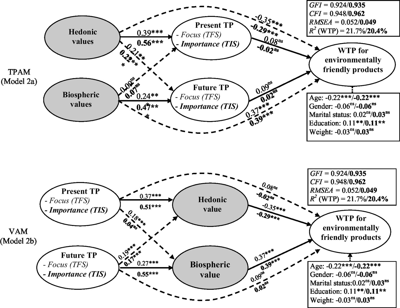We used structural equation modelling with latent variables in AMOS 24.0 (Arbuckle, 2015) to perform the analyses. We ran a confirmatory factor analysis (CFA) to examine the significance and convergent validity of the items and the discriminant validity of the constructs. Next, we tested three competing models, depicted in Figure 1, with two alternative TP scales: the TFS and the TIS. Based on Edwards & Lambert, 2007 general path analysis framework, we tested the mediator effect of hedonic and biospheric values in the path of T value of ps-WTP relationships (TPAM, Figure 1 Model 1b) and the mediator effect of present and future focus/importance in the path of values-TP-WTP relationships (VAM, Figure 1 Model 1c), respectively. We applied chi-square difference tests comparing a constrained versus an unconstrained model to examine the strength of the relationship between hedonic and biospheric values and time perspective constructs (i.e., a test of the strength/magnitude of asymmetric effects). At each stage, the model fit was evaluated using three standard metrics: the goodness-of-fit index (GFI), the comparative fit index (CFI), and the root mean square error of approximation (RMSEA). Good models require the GFI and CFI indices to be above 0.90 and the RMSEA to be lower than 0.08 (Hair et al., 2014).