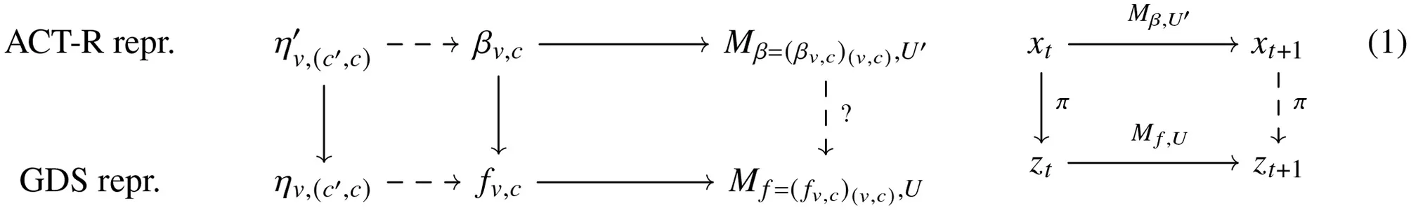 The cognitive behavioral components can be mapped into a GDS form by constructing a general approach to (i) translate cognitive models into GDS vertex functions βv, c→fv, c, (ii) match this for the associated transfer functions , and (iii) develop metrics for how well fv, c captures βv, c in preparation for assessing how well the system map at the GDS level (i.e., Mf, U in Equation (1)) captures the composed cognitive model . It is worth pointing out that the state space for the cognitive model and for the GDS translation need not be the same, thus there may be a mapping π connecting the two. Similarly, while it is likely that the update mechanism U and U′ for the assembly of local-to-global dynamics may be the same in both cases, this is not generally required (Róka, 1999).