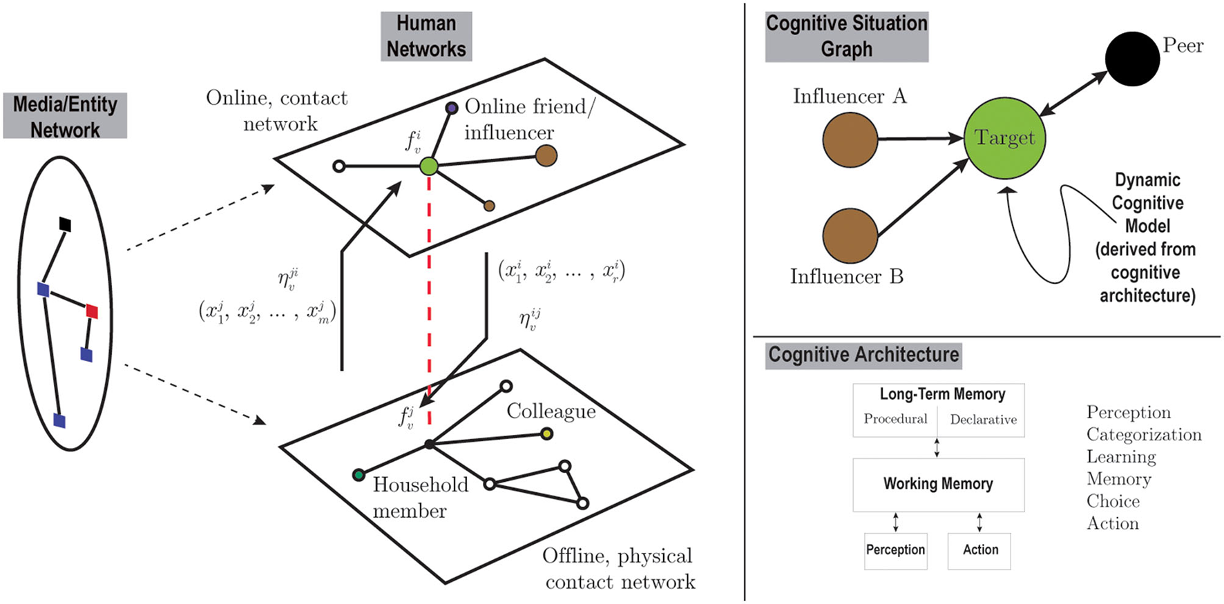 The 10-year prospectus imagined graphically shows the larger system graph illustrated on the left captured through coupled, co-evolving networks, possibly including mass media. Transfer functions (e.g., η1 and η2) govern how states associated to a different network layer (e.g., online) may influence dynamics in another network layer (e.g., physical contacts). A cognitive situation graph is illustrated in the top right, capturing dynamics at a compact level for the various agent classes present in the system network. Essential to this 10-year prospectus is the invocation of human cognitive architectures to realistically constrain mathematical models of system-level behavior.