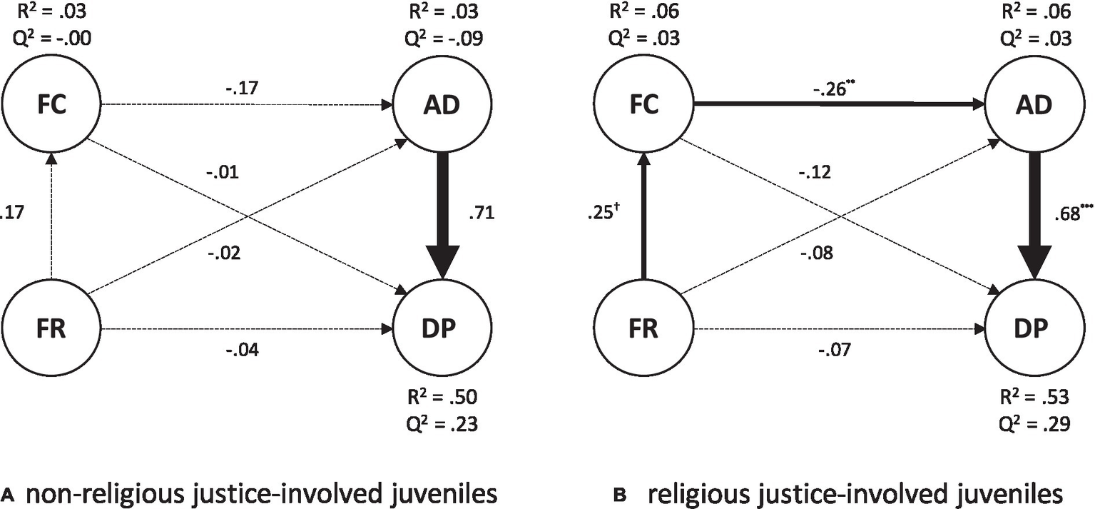 We hypothesized that the self-definition of religiosity among justice-involved juveniles could potentially impact model parameters and indirect effects. Accordingly, we tested the model separately for religious and nonreligious justice-involved juveniles, comparing the results between groups. Measurement model results are in Table 3. All indicators loaded on the respective latent variable above the standard threshold for indicator reliability in the religious group. For nonreligious justice-involved juveniles, an indicator of Family Climate (i.e., Communication with the father) failed to achieve the reliability standard. For both groups, all indicator variables loaded more on the latent variable they were supposed to measure than on another (Table 3). Reflecting the unsatisfactory performance of the Communication with the father indicator in the nonreligious group, the composite reliability for the Family Climate was below the threshold of 0.70. The remaining composite reliabilities were sufficient in both groups. Similarly, the AVE index was acceptable for all latent variables in both groups but for Family Climate for nonreligious justice-involved juveniles. Notwithstanding this, the square roots of the AVE were higher than the correlations of the latent variables with other latent variables in both groups (Table 2). The analyses have shown that composite and indicator reliability, convergent and discriminant validity of the constructs, were acceptable in both groups, except for Family Climate in nonreligious justice-involved juveniles.