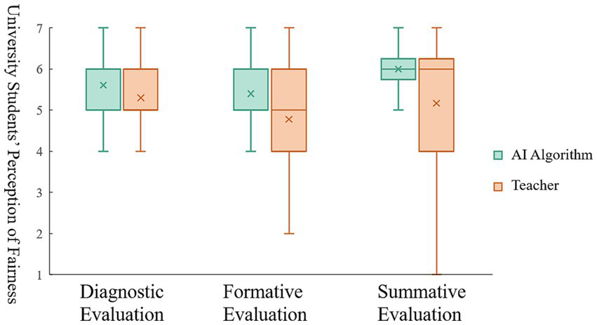 The second salient issue necessitates acknowledging that the evaluation type may influence students’ fairness perceptions. However, we did not consider it a variable but rather a research context. This decision was predicated on several key reasons. Primarily, our focus was on students’ fairness perceptions, not the evaluations themselves. Consequently, we sought to measure students’ fairness perceptions across different contexts to isolate the impact of assessment contexts on fairness perceptions. Our findings suggest that students’ fairness judgments of AI algorithmic evaluations and teacher evaluations exhibit similar trends across all three assessment contexts, indicating that the evaluation type does not significantly influence students’ fairness perceptions. Secondly, we aimed to underscore the subjective nature of assessment contexts rather than differences in assessment types. Despite variations in timing and roles of diagnostic, formative, and summative evaluations, all three essentially constitute subjective assessments. The contrast between human evaluators (teachers) and machine evaluators (AI algorithms) introduces a significant difference in subjective evaluation, likely contributing to variations in students’ fairness perceptions. It is this evaluative discrepancy, rather than the specific assessment context, that accounts for differences in students’ fairness perceptions. Consequently, we opted to use different evaluation types as contexts in our study, rather than as variables.