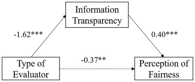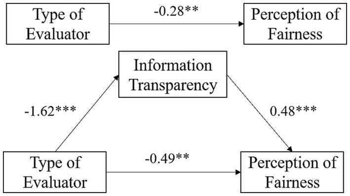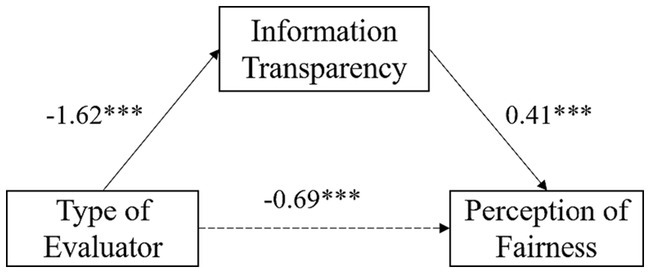 In formative evaluation, equation 1 showed that the evaluator significantly predicted the perception of fairness (β = −0.69, SE = 0.22, p < 0.001). According to equation 2, the evaluator significantly predicted information transparency (β = −1.62, SE = 0.11, p < 0.001). And following equation 3, when both the evaluator and information transparency entered the regression equation, the evaluator could not significantly predict the perception of fairness (p > 0.05), whereas information transparency significantly predicted the perception of fairness (β = 0.41, SE = 0.07, p < 0.001). Therefore, information transparency played a full mediating effect between the evaluator and the perception of fairness, with the mediating effect accounting for 49.05% of the total effect (See Figure 4).