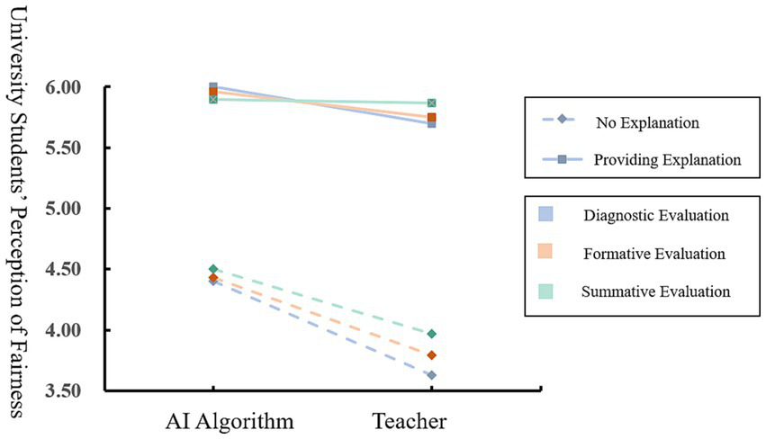 The results showed that the interaction between the evaluator and the explanation could have a significant positive effect on the perception of fairness in diagnostic evaluation (β = 0.43, SE = 0.19, p < 0.05), and the specific moderating effect was shown in Figure 6. Moreover, according to the results, when there was no explanation, there was a significant difference between the student’s perception of fairness brought by the AI algorithm and that brought by the teacher (MAI = 4.40, MTeacher = 3.63, t(145) = −5.60p < 0.001). However, when there was an explanation, the influence of the evaluator on the perception of fairness diminished, and the difference between the perception of fairness under the two evaluators was no longer significant (MAI = 6.03, MTeacher = 5.70, t(145) = 2.42, p>0.05).