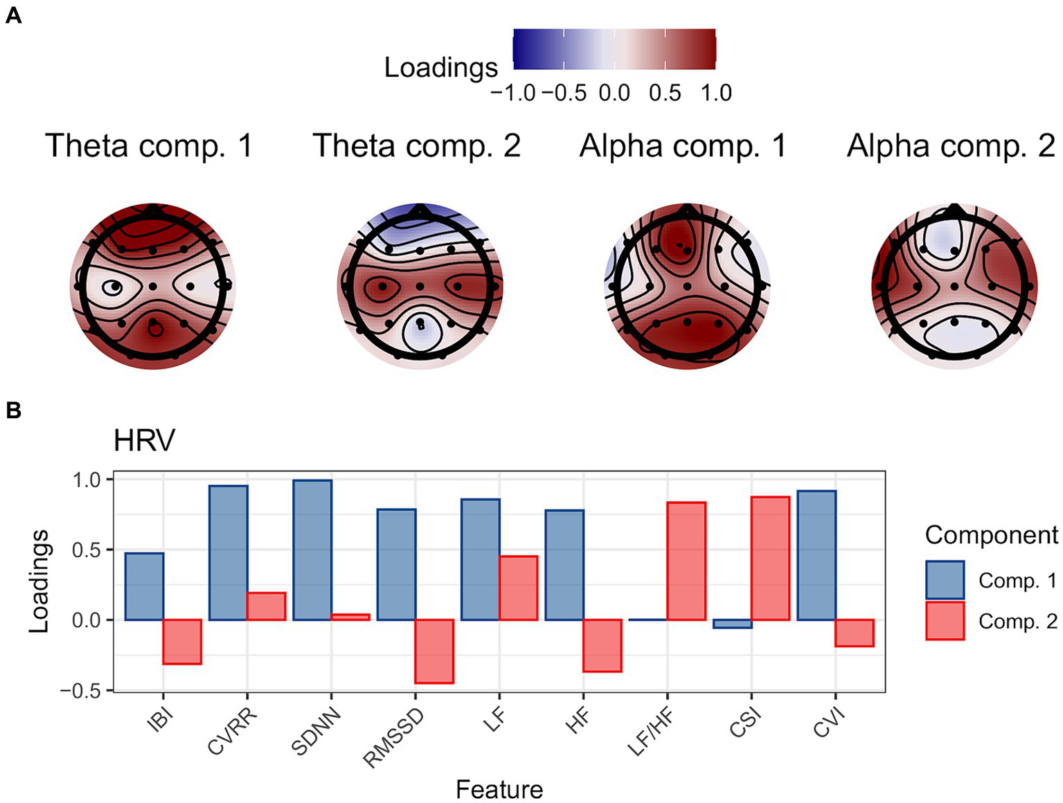 The loadings of PCA for (A) theta and alpha-band powers (shown in topographical map), and (B) HRV measurements.