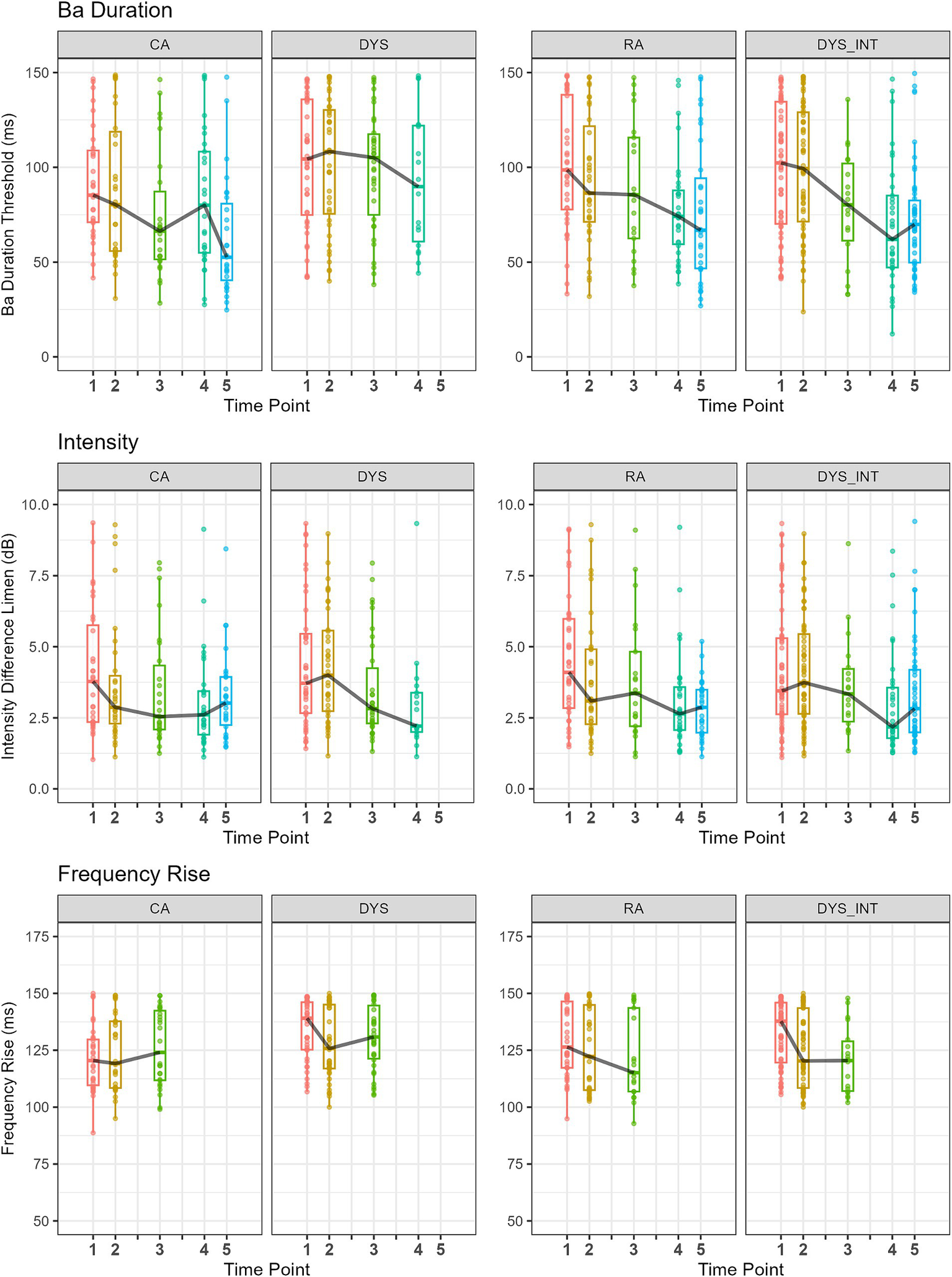 To investigate the main effects and the interaction of Time Point (TP) and group membership (CA, DYS, RA) on the development of the auditory threshold measures, linear mixed effect models were run for each of the outcome variables Sine Rise, SSN Rise, Ba Rise, Frequency Rise, Intensity, and Duration, using the packages lme4 (Bates et al., 2015) and lmerTest (Kuznetsova et al., 2017) in R (R Core Team, 2020). This enabled a systematic comparison of our groupings (CA, DYS; CA, RA; DYS, RA) and their performance at the different TPs 1–3.
