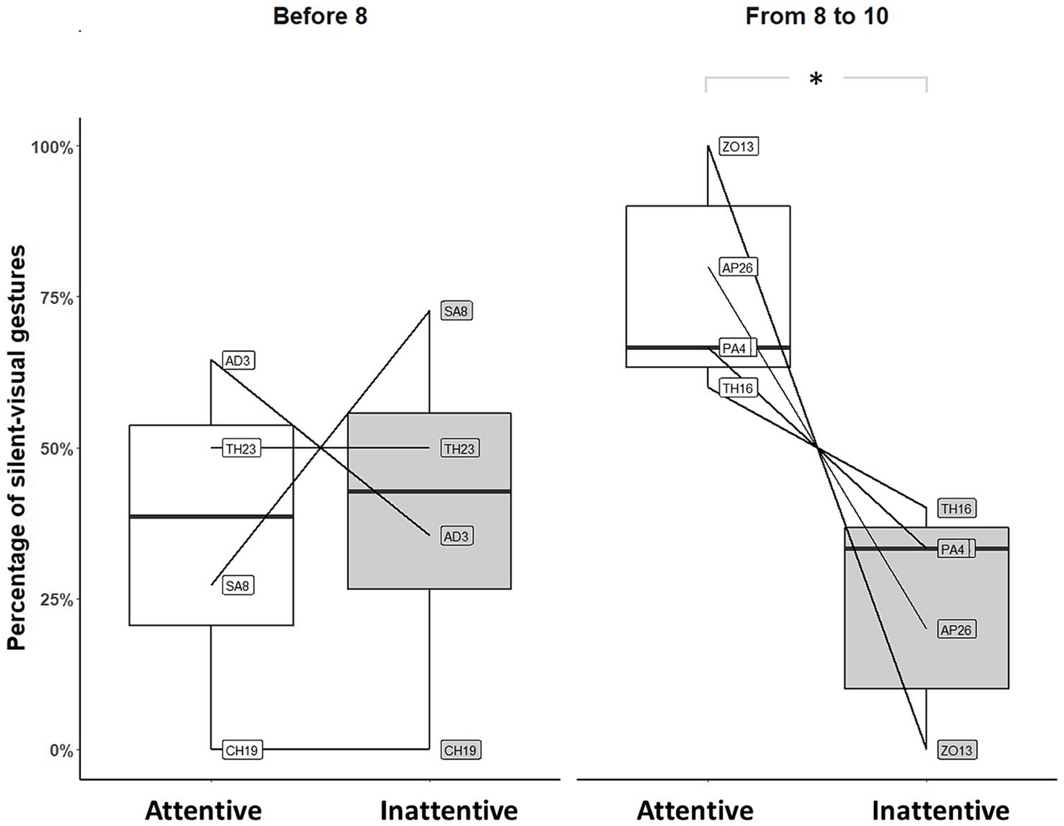 Figure 2. Distribution of silent-visual gestures produced by individuals before and after 8 months of age in front of silent mothers (*p-value<0.05). Large black circles represent the mean proportion per subject. Median (horizontal lines), quartiles (boxes), percentiles (2.5 and 97.5%), vertical lines, and outliers (small black circles) are indicated. Data from the first observation only are represented. Infants not exposed to attentive and inattentive mothers during the first observation were removed from the analysis.