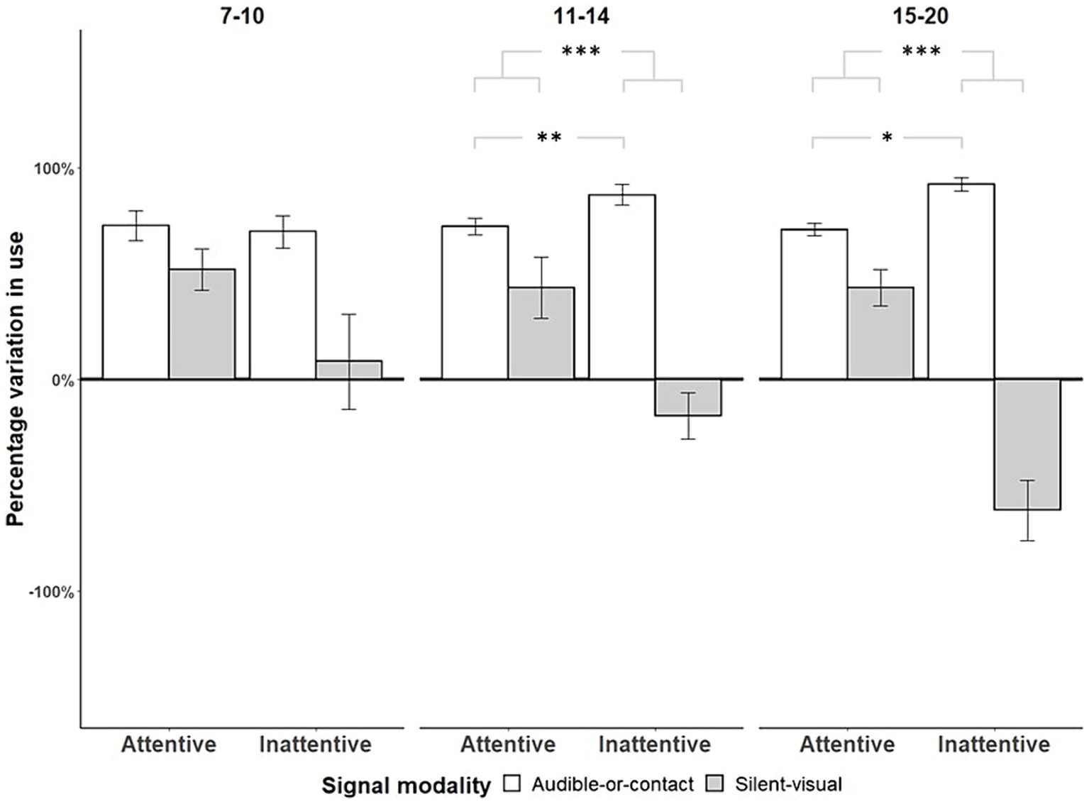 Figure 3. Variation in use of audible-or-contact and silent-visual gestures with respect to maternal visual attention by age range when the mothers were silent (N = 11, *p < 0.05, ***p < 0.001). The deviations above and below the zero-line show changes (plus standard error bar) in the use of each modality, according to the maternal state of attention before signalling, from the overall average use of that modality in signalling. To represent active adjustment of the different gesture modalities towards the maternal visual attention state, we calculated the percentage deviation in the variation in the use of audible-or-contact as compared with silent-visual gestures for each condition of maternal attention and age category (as Hobaiter and Byrne, 2011). The deviation was calculated by (β/α − 1) × 100 with α = number of audible-or-contact signals/total number of signals used in the age-range subgroup, and β = number of audible-or-contact signals /total number of signals used in the condition and age-range subgroup.