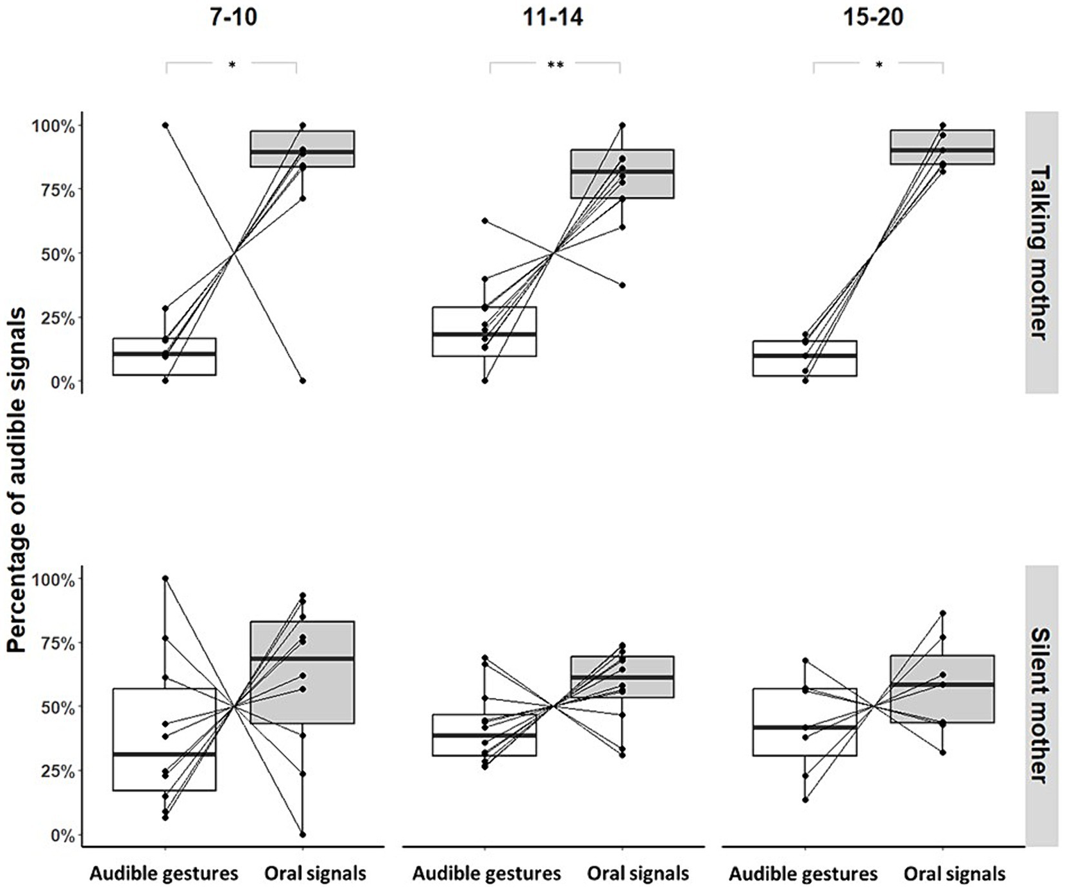Figure 4. Proportions of audible gestures and oral signals produced by individual and age range when the mothers did not show visual attention (*p-value<0.05; **p-value<0.01). Large black circles represent the mean proportion per subject. Median (horizontal lines), quartiles (boxes), percentiles (2.5 and 97.5%), vertical lines, and outliers (small black circles) are indicated. Silent mother refers to the condition without IDS; Talking mother refers to the condition with IDS.