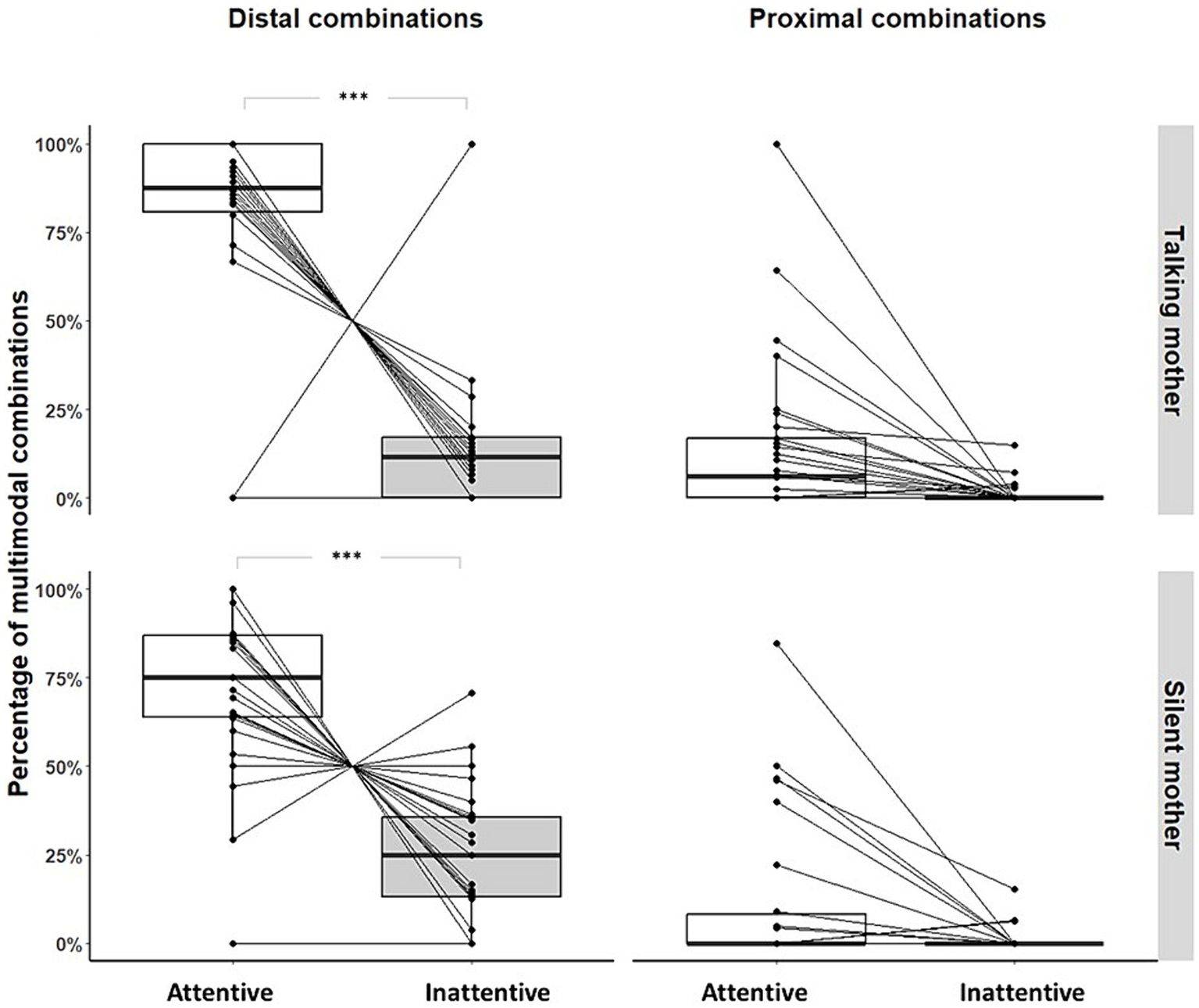 Figure 5. Distribution of distal and proximal multimodal combinations produced by individual and maternal visual condition (*p-value<0.05; **p-value<0.01; ***p-value<0.001). Large black circles represent the mean proportion per subject. Median (horizontal lines), quartiles (boxes), percentiles (2.5 and 97.5%), vertical lines, and outliers (small black circles) are indicated. Silent mother refers to the condition without IDS; Talking mother refers to the condition with IDS.