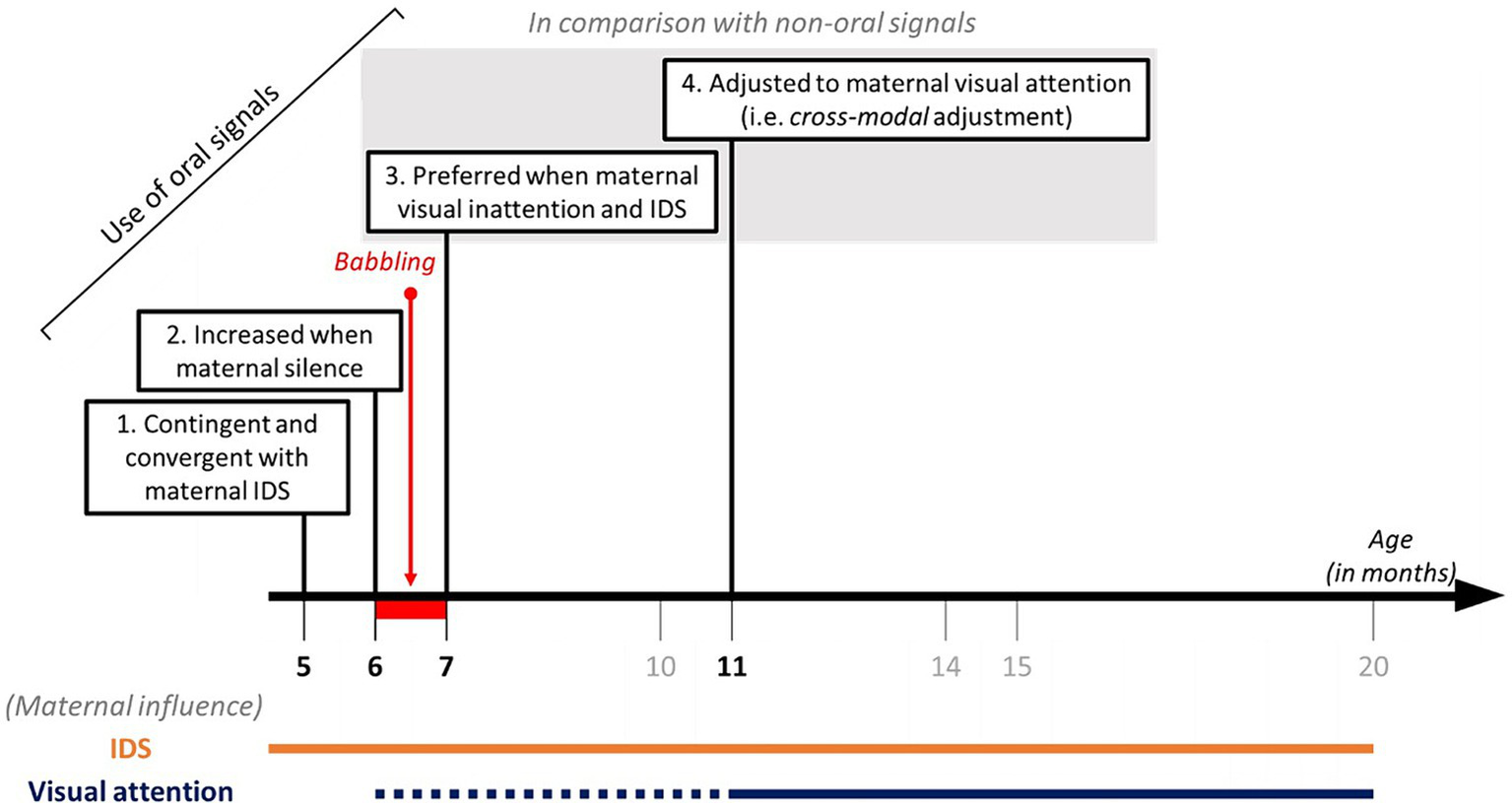 The present study brings novel findings on the development of the voluntary use of the voice (vocal control) by human infants. Figure 6 summarises the recent evidence on this topic. Five-month-old infants already produce oral signals that are contingent and convergent in terms of acoustic parameters with the caregiver’s IDS (Whalen et al., 1995; Holowka and Petitto, 2002; DePaolis et al., 2013; Fröhlich and van Schaik, 2020; Northrup and Iverson, 2020). At 6 months of age, infants increase their production of audible signals (both gestural and oral) when the mothers are silent, regardless of their visual attention state (Delgado et al., 2002; Bourjade et al., 2023). The current results suggest two additional steps in the development of vocal control and its integration into an extended multimodal communication system. At 7 months, infants preferentially use oral sounds over audible gestures to address a visually inattentive mother who is talking to them (Figures 3, 4, 6). Then, 11-month-old infants are truly capable of cross-modal adjustment, based on the global preference for oral signals to address visually inattentive mothers who are talking to them (Figures 4, 6). These findings contribute important knowledge on the developmental acquisition of pragmatic skills that rely on voluntary control of the voice. Visual breakdowns from the mother, together with her infant-directed speech appear to scaffold an infant’s capabilities for controlling oral signals, including voluntary usage of the voice.