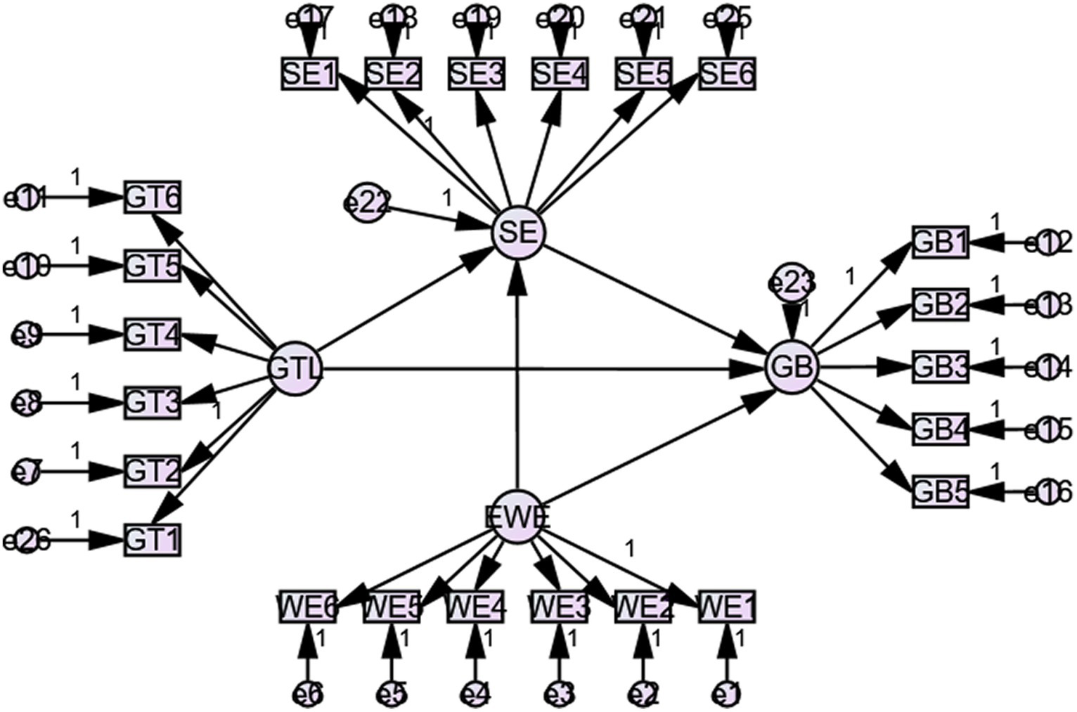 Figure 1 presents the conceptual model of our study. Making an appeal to the TL theory, SET, and SCT, it has been hypothesized that GTL affects EGBs through enhancing FSE. Further, the impact of GTL on FSE and the consequent impact of FSE on EGBs is moderated by the EWE.
