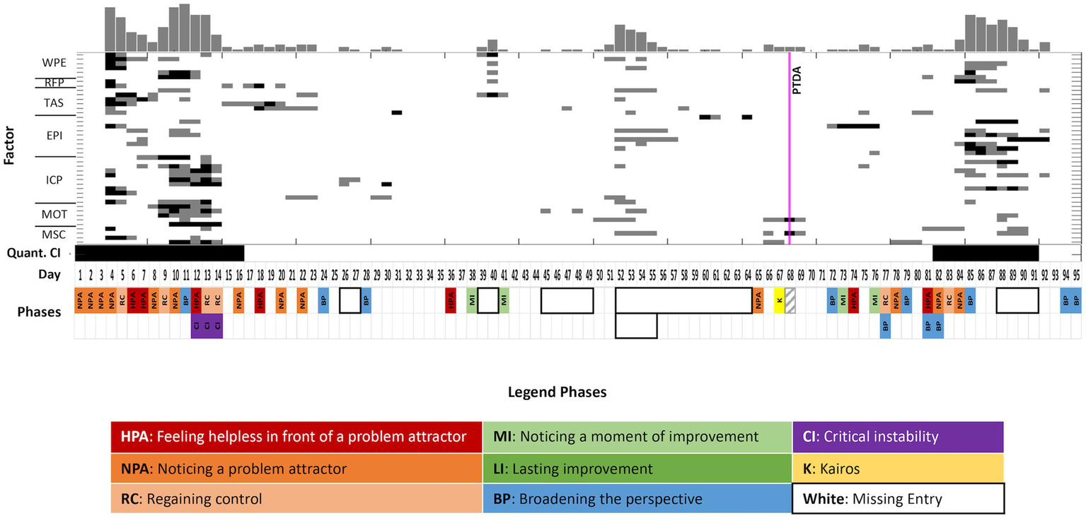 By relating time series data and diary data, the present study tries to link a nomothetic perspective on self-organized pattern transitions with the idiographic perspective of patients’ subjective experiences to contribute to a deeper understanding of the therapeutic journey. Relating the two perspectives may also enable the transfer of research findings to clinical practice.