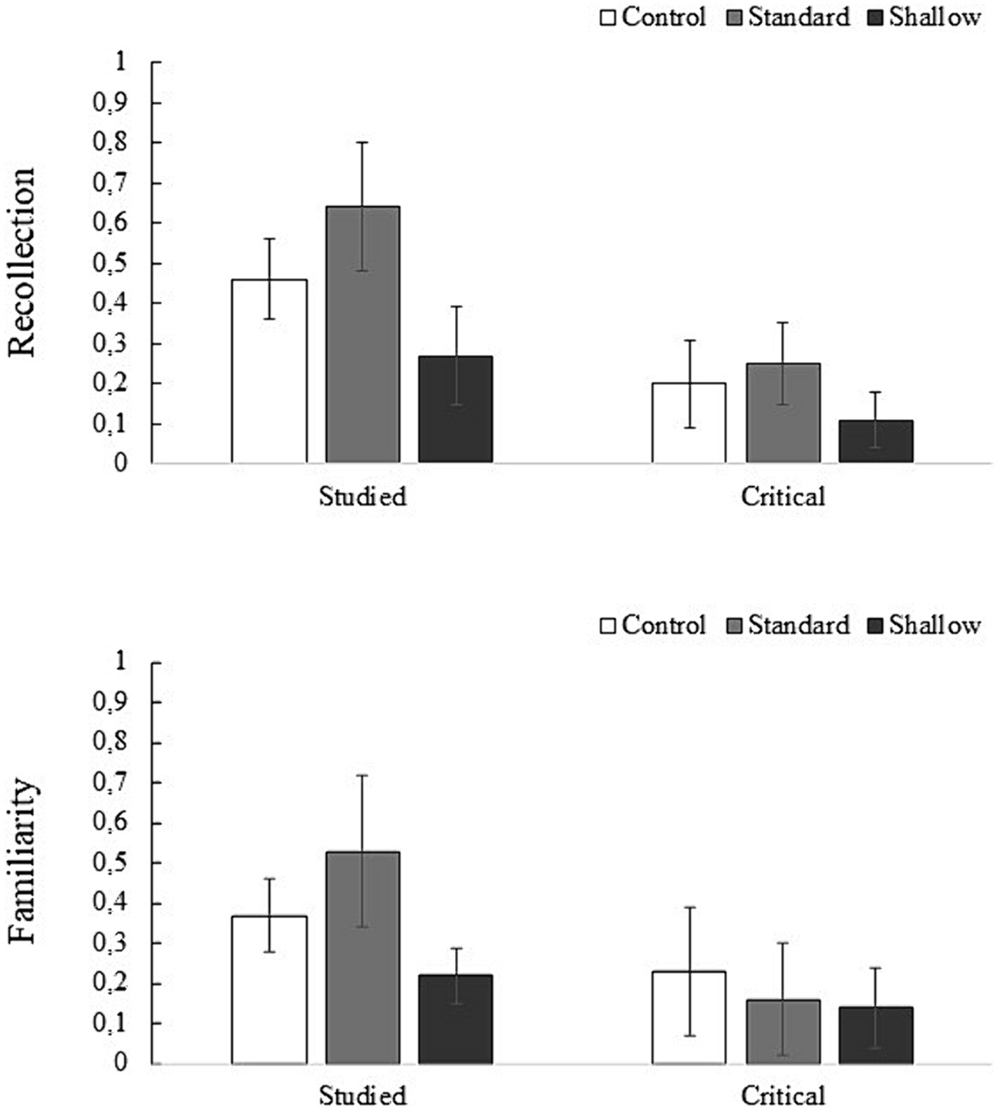 In the recollection estimate of the critical lures there was a significant effect of the type of encoding, F(2, 111) = 6.35, p = 0.002, ηp2 = 0.10. The control encoding was not significantly different from either the standard or shallow conditions (0.20 vs. 0.25), t(77) = 1.42, p = 0.478, and (0.20 vs. 0.11), t(73) = 2.19, p = 0.092. However, the standard condition showed greater recollection than the shallow one (0.25 vs. 0.11), t(72) = 3.55, p = 0.002. The same ANOVA on the familiarity estimate of the critical lures showed no effect of encoding type, F(2, 111) = 2.18, p = 0.118.