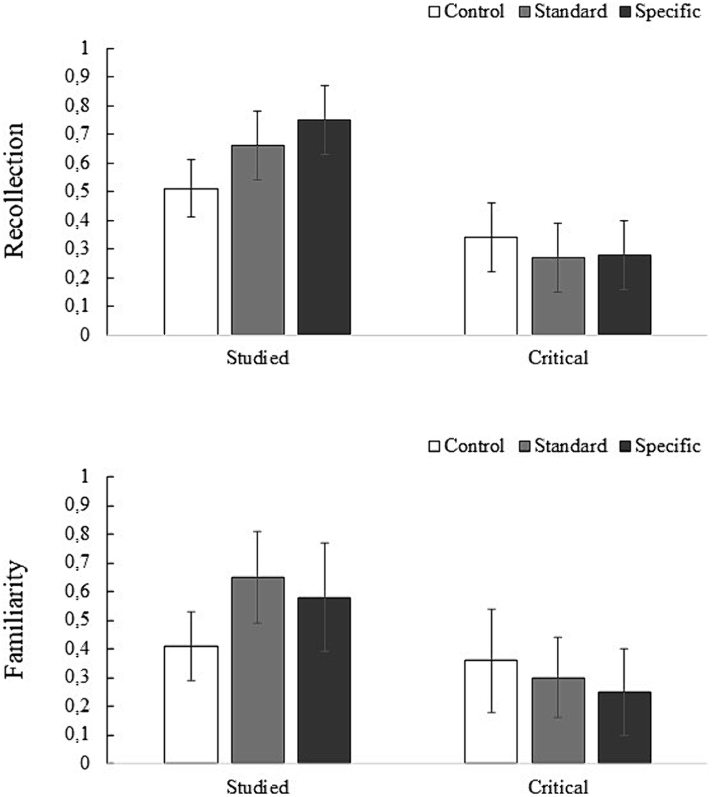 The same analyses were carried out as in Experiment 1. Table 2 sets out the mean proportion of “Yes” responses and mean signal-detection indexes on the recognition test as a function of item type for the encoding conditions. Figure 2 shows the recollection and familiarity estimates for the studied and critical items for each type of encoding.