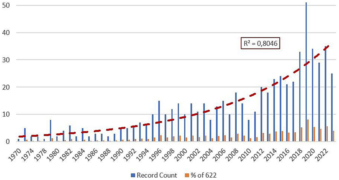 According to the data obtained from the WoS, the first study on school refusal was in 1970. Until 1995, the number of publications varied between 1 and 5 (except in 1979). While the publication rate until 1995 was 12%, it reached 31% between 1996 and 2011. In 2012 and 2023, the publication rate was found to be 57%. As a result, school refusal has been handled more intensively by researchers, especially, in the last 12 years.