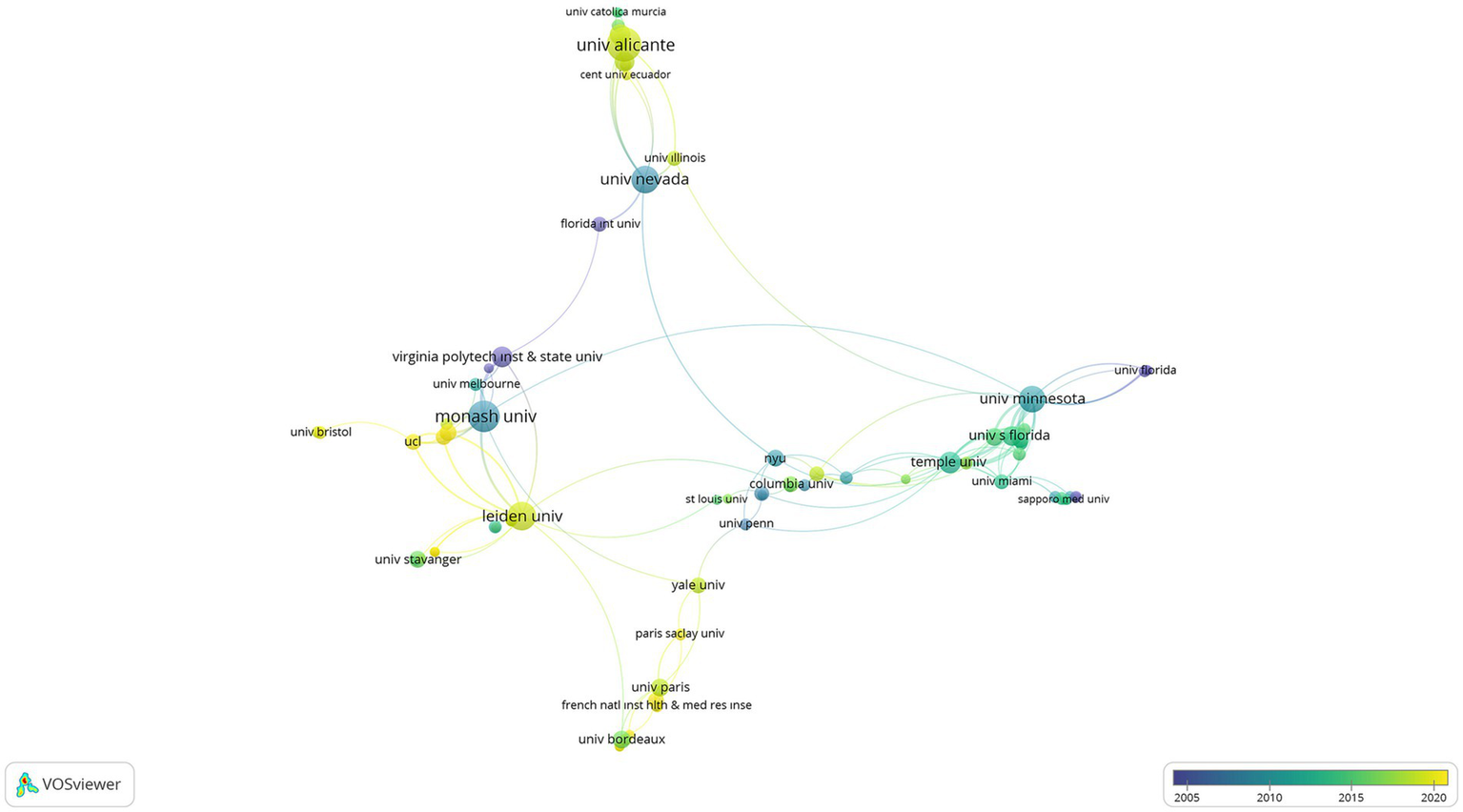 According to Figure 4, in all these organizations, University of Alicante, University Nevada, Virginia Polytech Institute and State University, Monash University, University Minnesota, Florida International University, Leiden University, University of Pennsylvania, Miguel Hernandez University of Elche Spain, Temple University, New York University, University Utrecht, University Stavanger, John Hopkins University organizations were found to be at the forefront of SR. Also, according to Figure 5, University of Alicante, Central University of Ecuador, University Illinois, University Bristol, Leiden University, University College London, Monash University, French Institute of Health and Medical Research Institute, Paris Saclay University, Yale University, and University Paris has come to the fore in recent years at the point of establishing scientific collaborations. In addition, citations to research related to SR are presented in Table 1 by organizations.