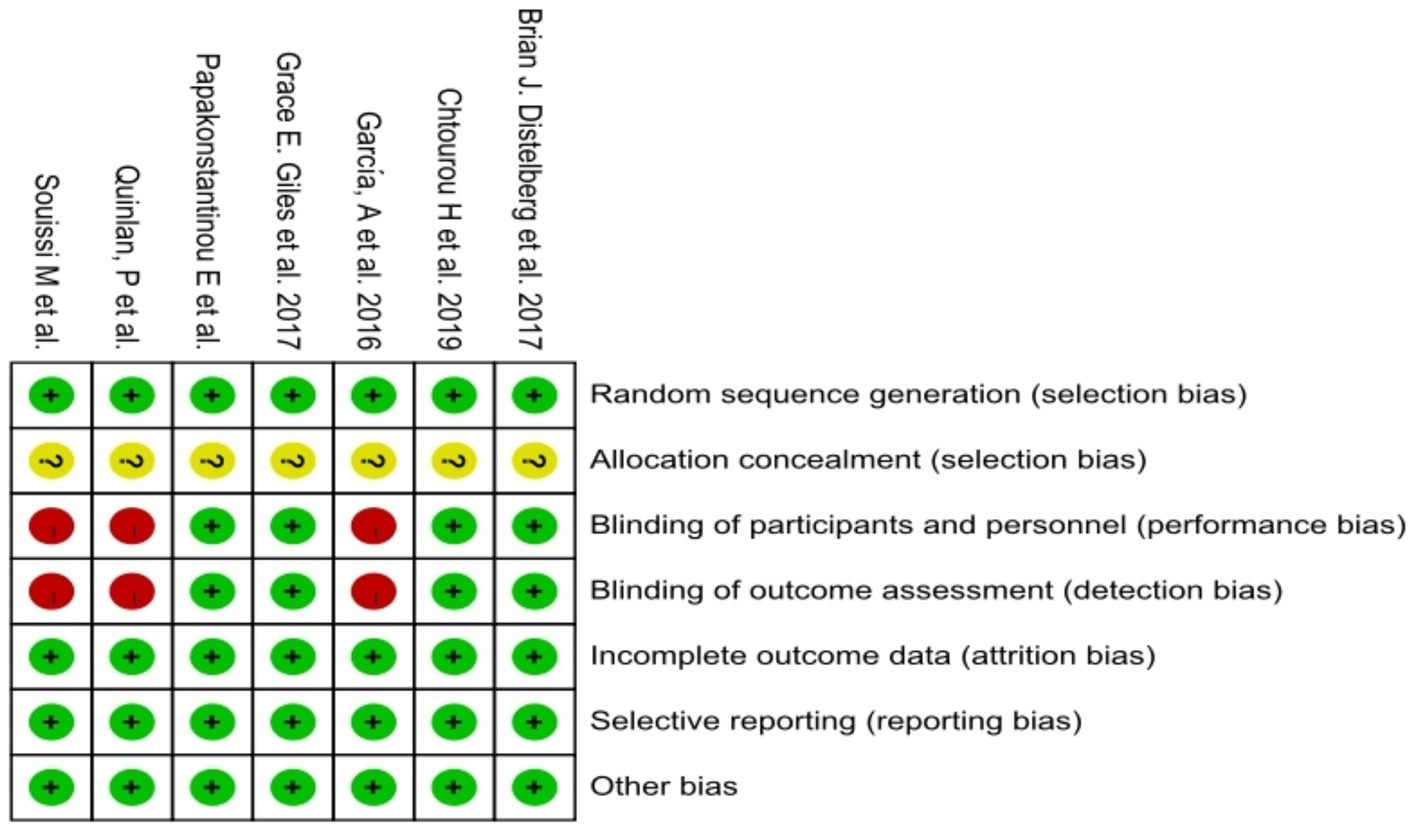 A total of eight papers (Quinlan et al., 1997; Souissi et al., 2012; Jin et al., 2016; Papakonstantinou et al., 2016; Distelberg et al., 2017; García et al., 2017; Giles et al., 2017; Chtourou et al., 2019) were included in this study. The included studies comprised approximately 546 study participants. Characteristics of these eight studies are shown in Table 1, including seven RCTS and one cross-sectional study. Regarding the study region, two studies were conducted in Europe, two in Tunisia, three in America and one in Korea. Eight studies included adults with elevated levels of anxiety by BAI, POMS, STAI, SAS scales. According to the methodological assessment of the included literature, seven RCTS reached a moderate risk of bias (Figures 2, 3). One CS scored 16 with a high quality.
