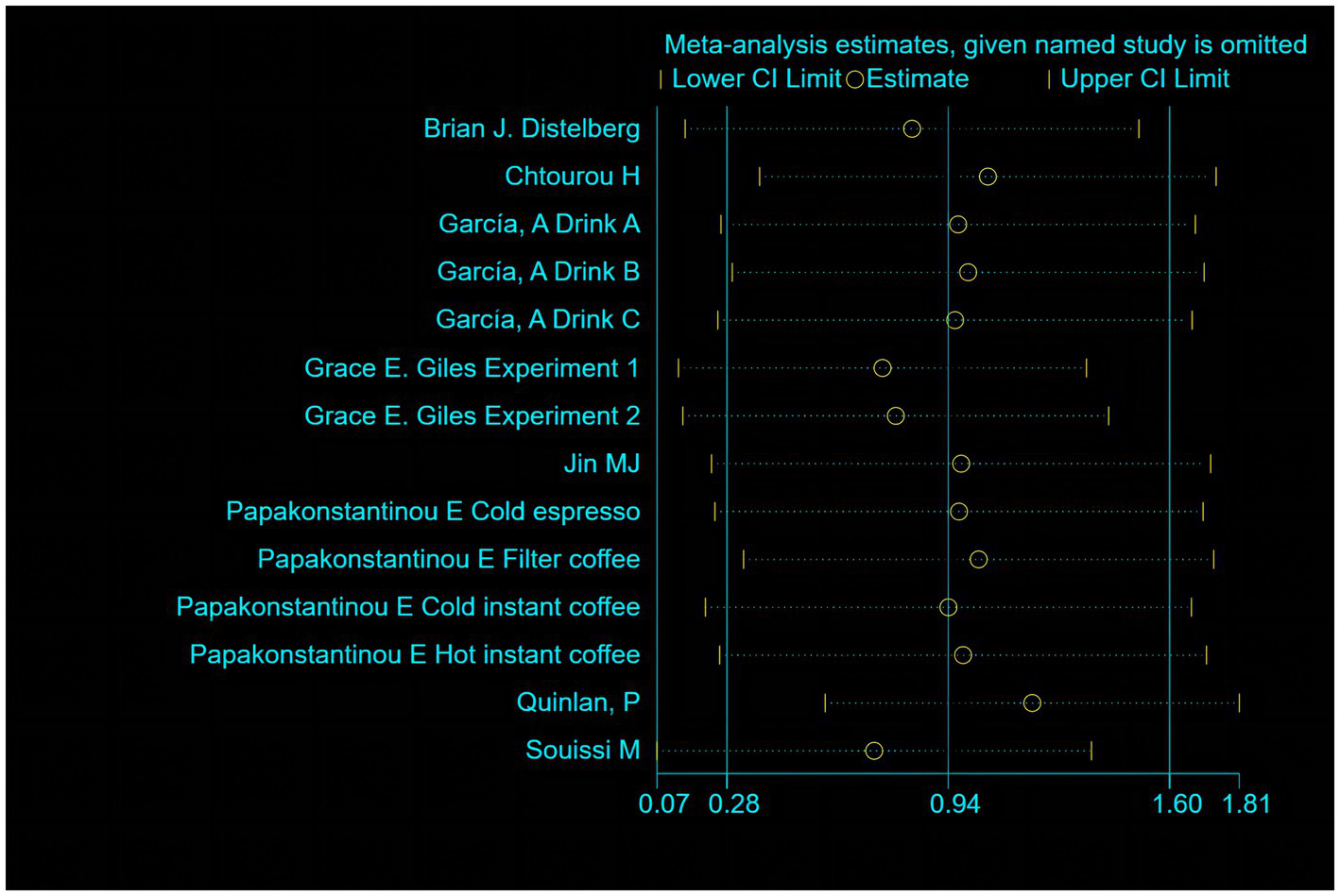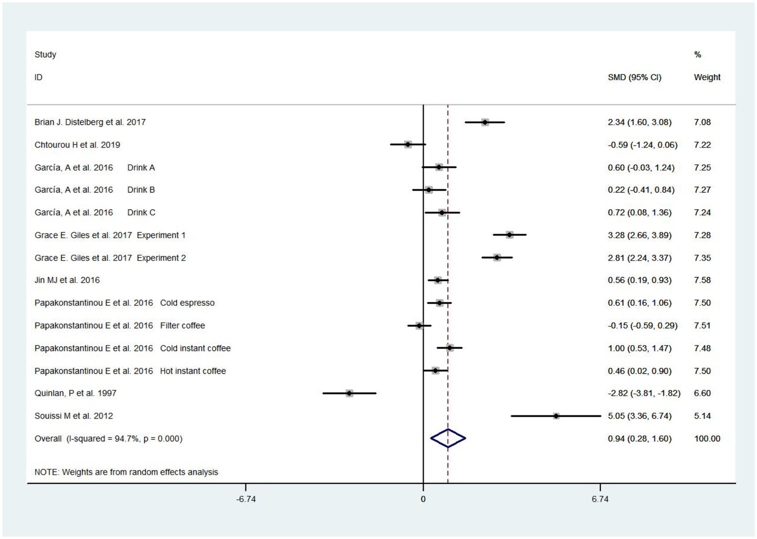 | Papakonstantinou et al. (2016) Greece | RCT | 40 Healthy individuals | Randomly consumed four 200 mL coffee beverages containing 160 mg caffeine | 1 h | SAS |