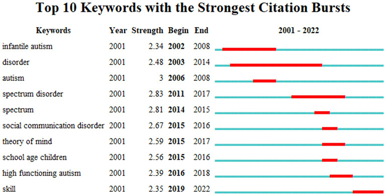 From 2019 to 2022, the keyword “skill” emerged as a prominent trend, indicating a future frontier and direction in research. This evolution in focus elucidates the progression of research on pragmatic impairment in children with autism: from early descriptions and interpretations of autism spectrum disorders in young children, to the examination of social interaction difficulties and theory of mind in high-functioning autistic school-age children, to the current focus on the investigation of their specific skills.