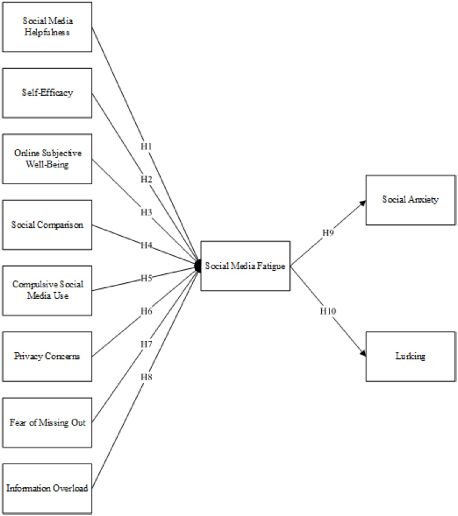 The primary theoretical framework for this study on social media fatigue encompasses cognitive load theory (CLT), social cognitive theory, and social comparison theory. These theories offer an in-depth understanding of the psychological and emotional factors that lead to social media fatigue. Cognitive load theory, suggests that individuals have a finite capacity for processing information (Sweller and Chandler, 1991; Sweller, 2023). In the realm of social media, users often encounter an overwhelming amount of information, resulting in cognitive overload and subsequent fatigue (Kirschner et al., 2018). This theory clarifies why information overload and compulsive use of social media are pivotal antecedents of social media fatigue (Chen et al., 2023). Additionally, social comparison theory, asserts that people assess their social and personal worth by comparing themselves to others (Festinger, 1954; Powdthavee, 2024). On social media, this frequent comparison can lead to negative self-assessments and fatigue (De Vries et al., 2023). This theory supports the inclusion of social comparison and FOMO as key antecedents in this research (Gupta et al., 2021). Lastly, this research also employed social cognitive theory which indicates an individual’s confidence in coping with life stress and achieving performance (Chou et al., 2024). This theory supports the social media self-efficacy antecedent of this research (Almulla and Al-Rahmi, 2023). The selected antecedents—social media helpfulness, social media self-efficacy, online subjective well-being, social comparison, compulsive social media use, privacy concerns, FOMO, and information overload—are grounded in these theories (Rezabeigi Davarani et al., 2023; Sweller, 2023). Collectively, they provide a solid theoretical foundation for exploring the determinants and consequences of social media fatigue (Jabeen et al., 2023). The research aims to understand how these factors contribute to fatigue and its effects on social anxiety and lurking behaviors, offering valuable insights for social media marketers and internet service providers.